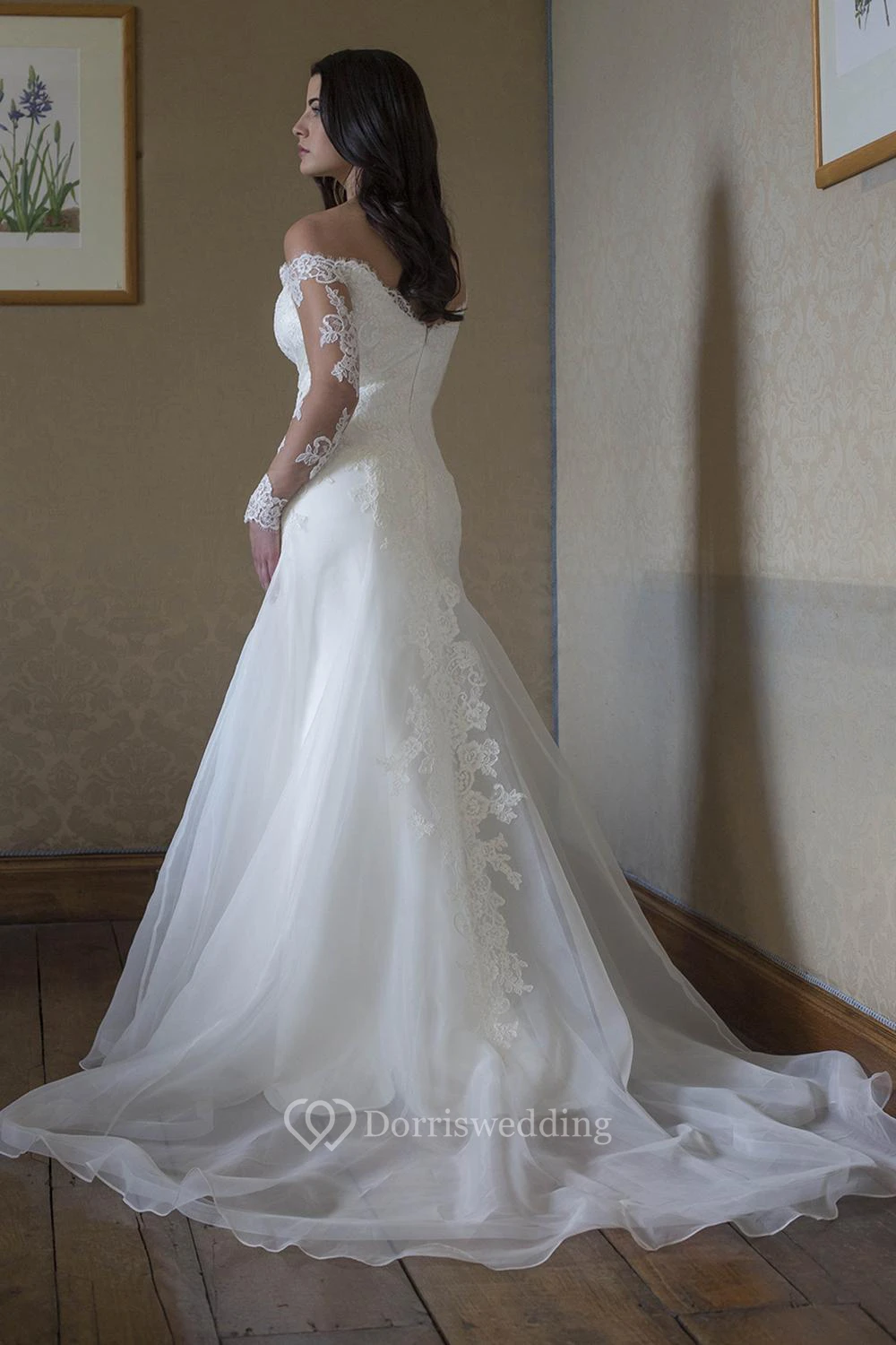 Long-Sleeve Off-The-Shoulder Floor-Length Tulle&Lace Wedding Dress With Appliques And V Back