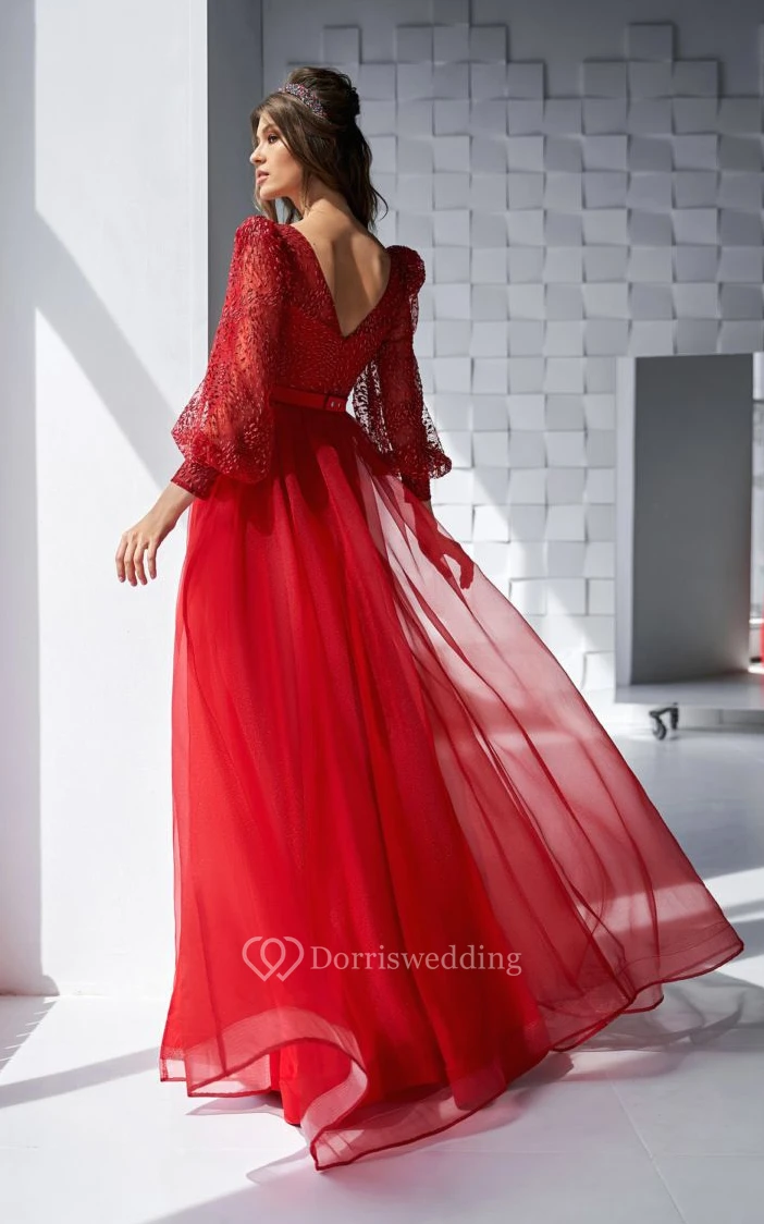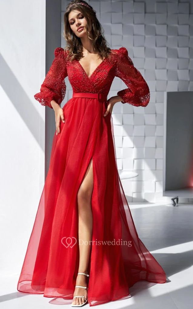 Long Sleeve Plunged Chiffon Red Front Split Dress with Beaded top