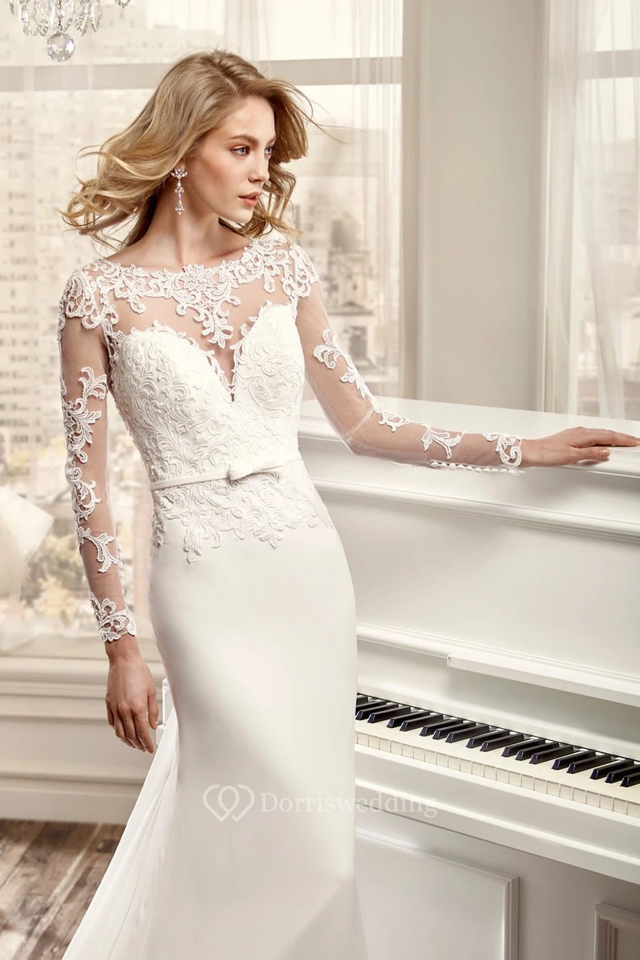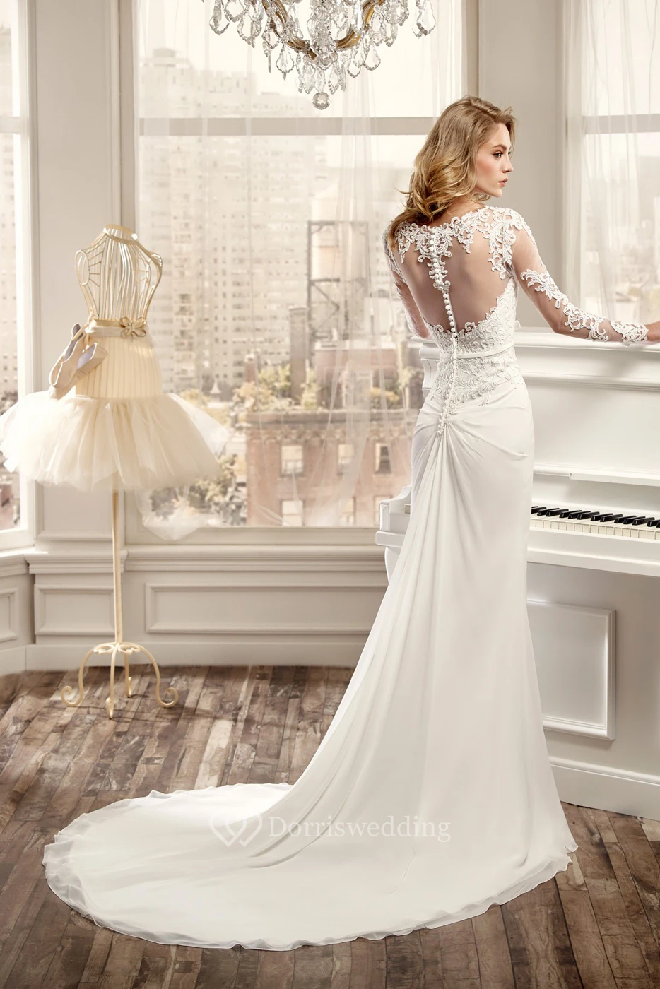 Long-Sleeve Sheath Elegant Wedding Dress With Brush Train And Back Draping