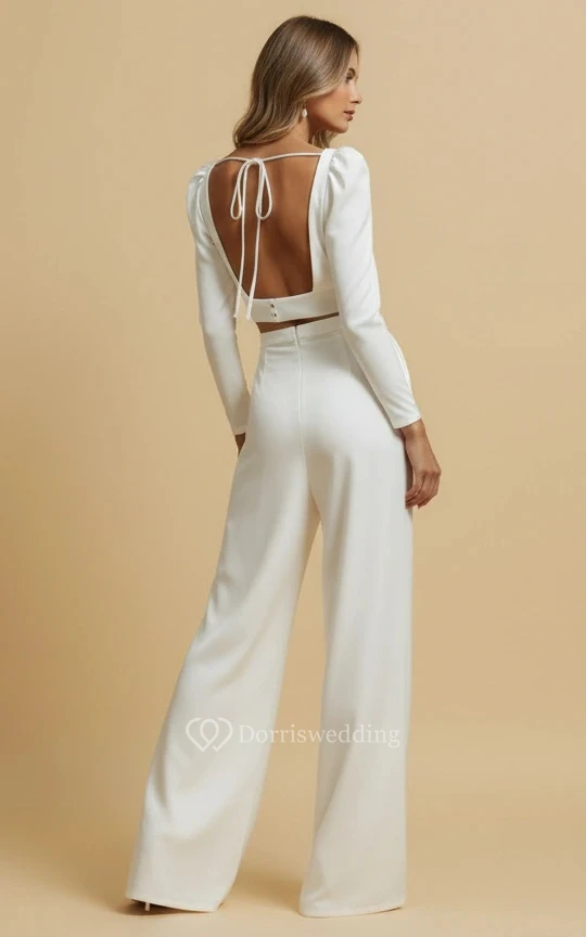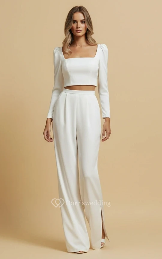 Long Sleeve Square Neck High Waist Wide Leg Wedding Jumpsuit with Side Slit
