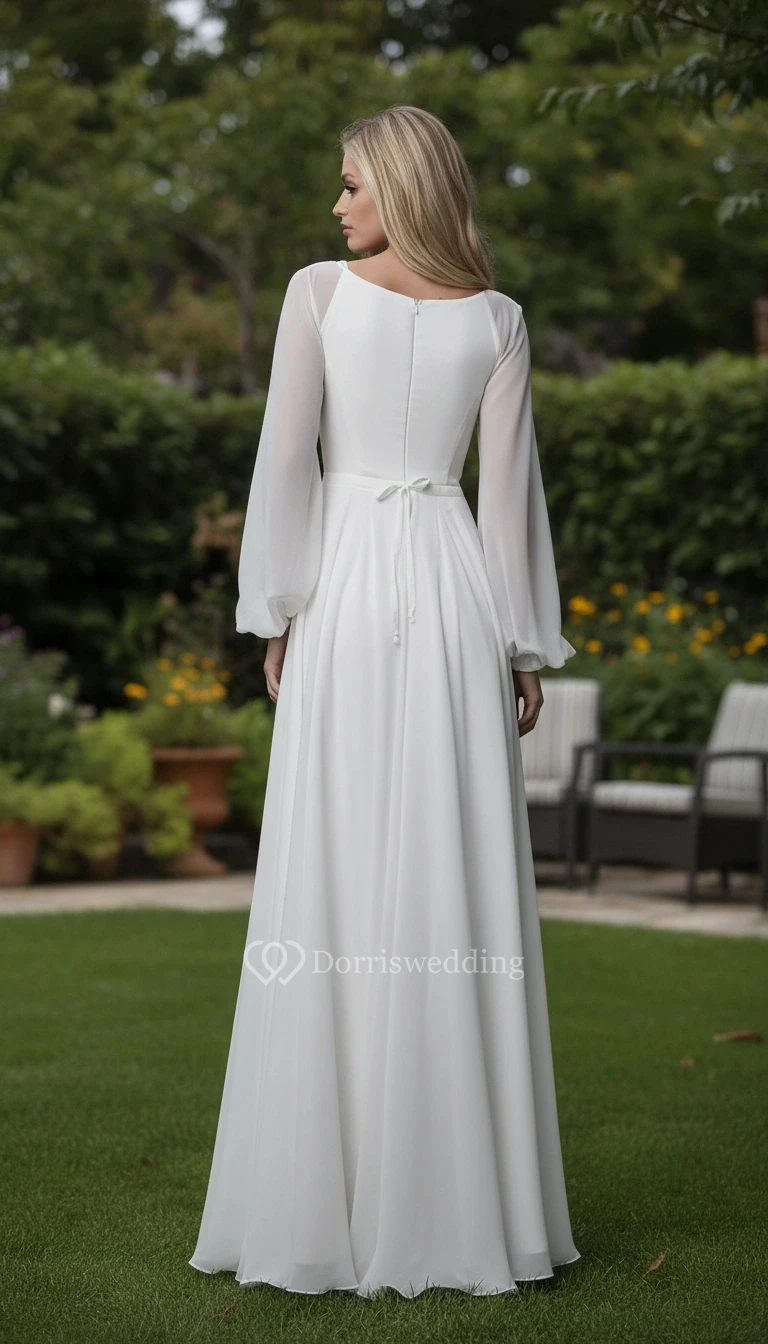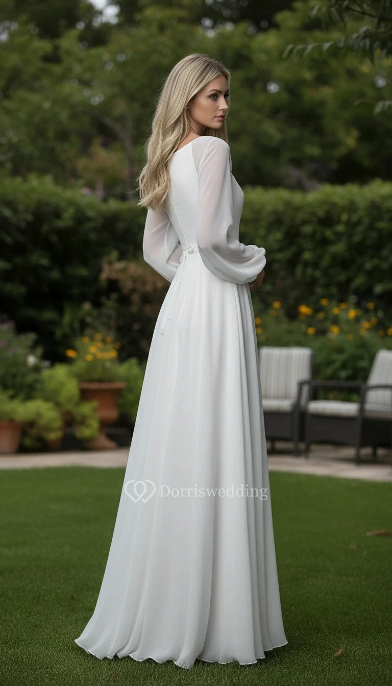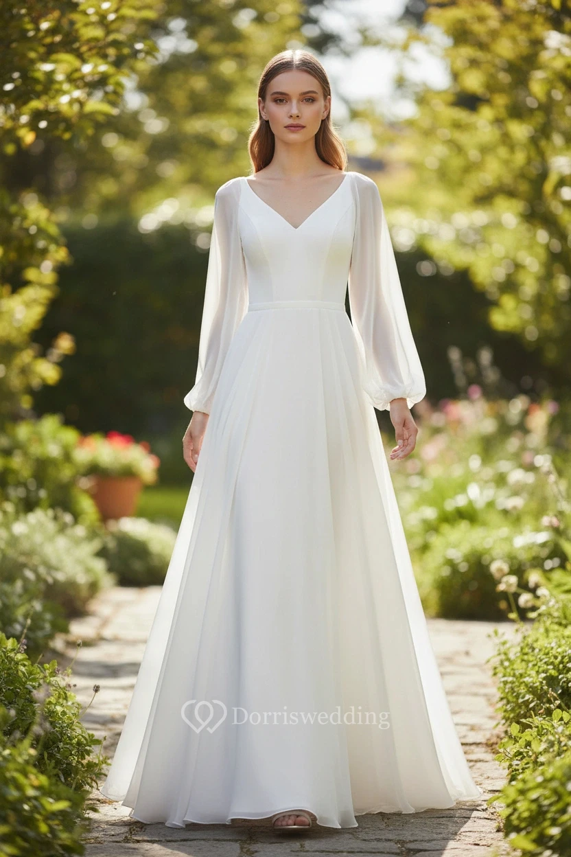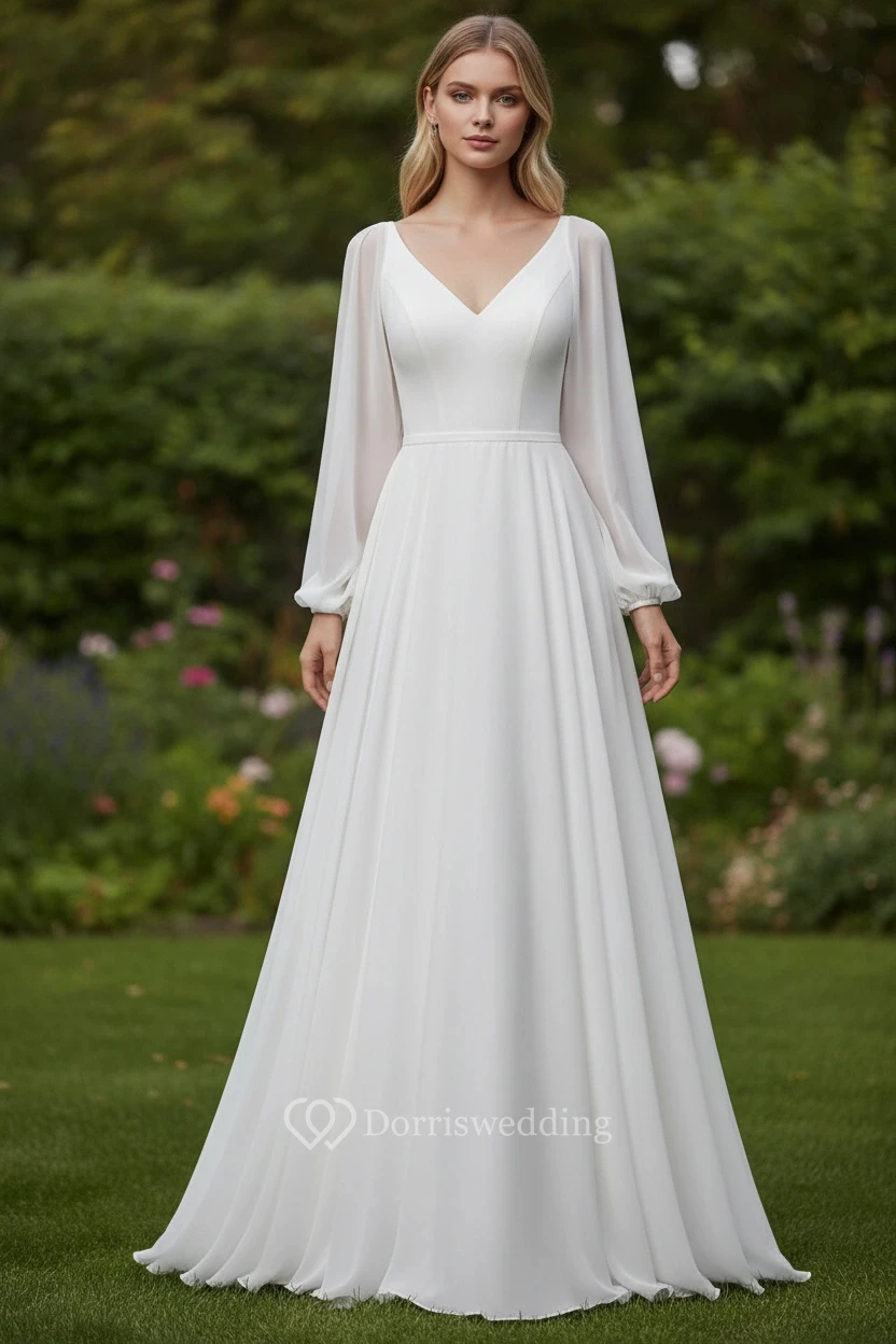 Long Sleeve V-Neck Chiffon A-line Simple Wedding Dress