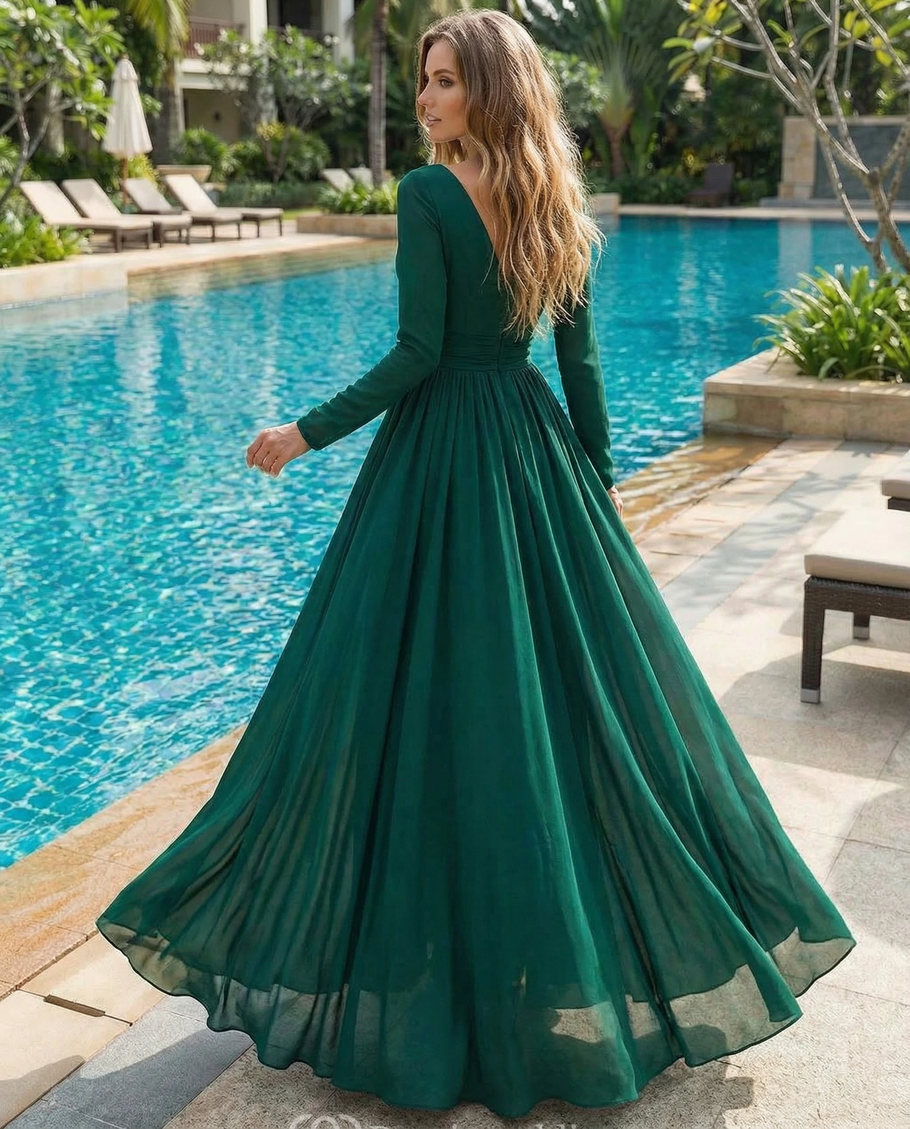 Long-Sleeve V-Neck Satin A-Line Gown