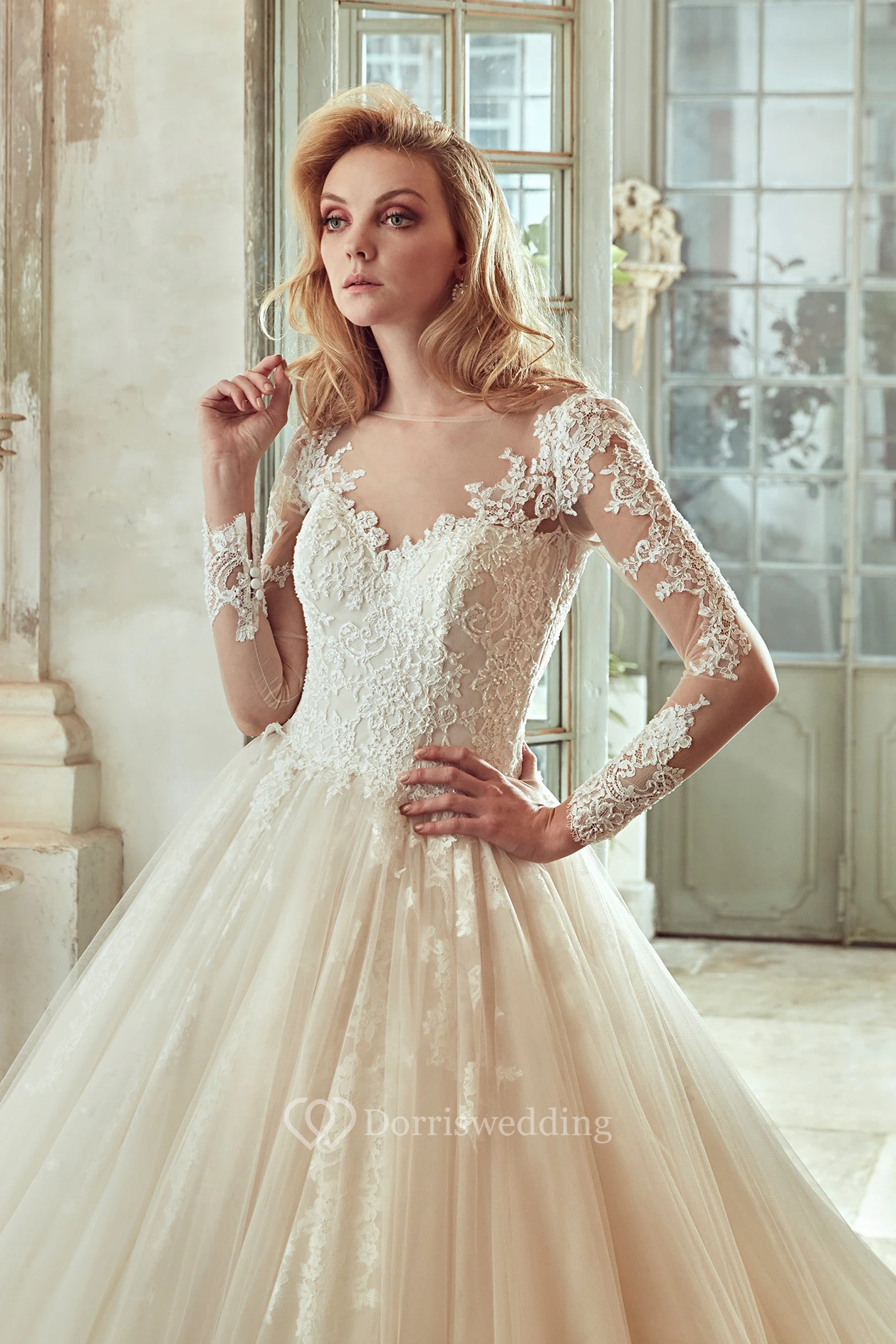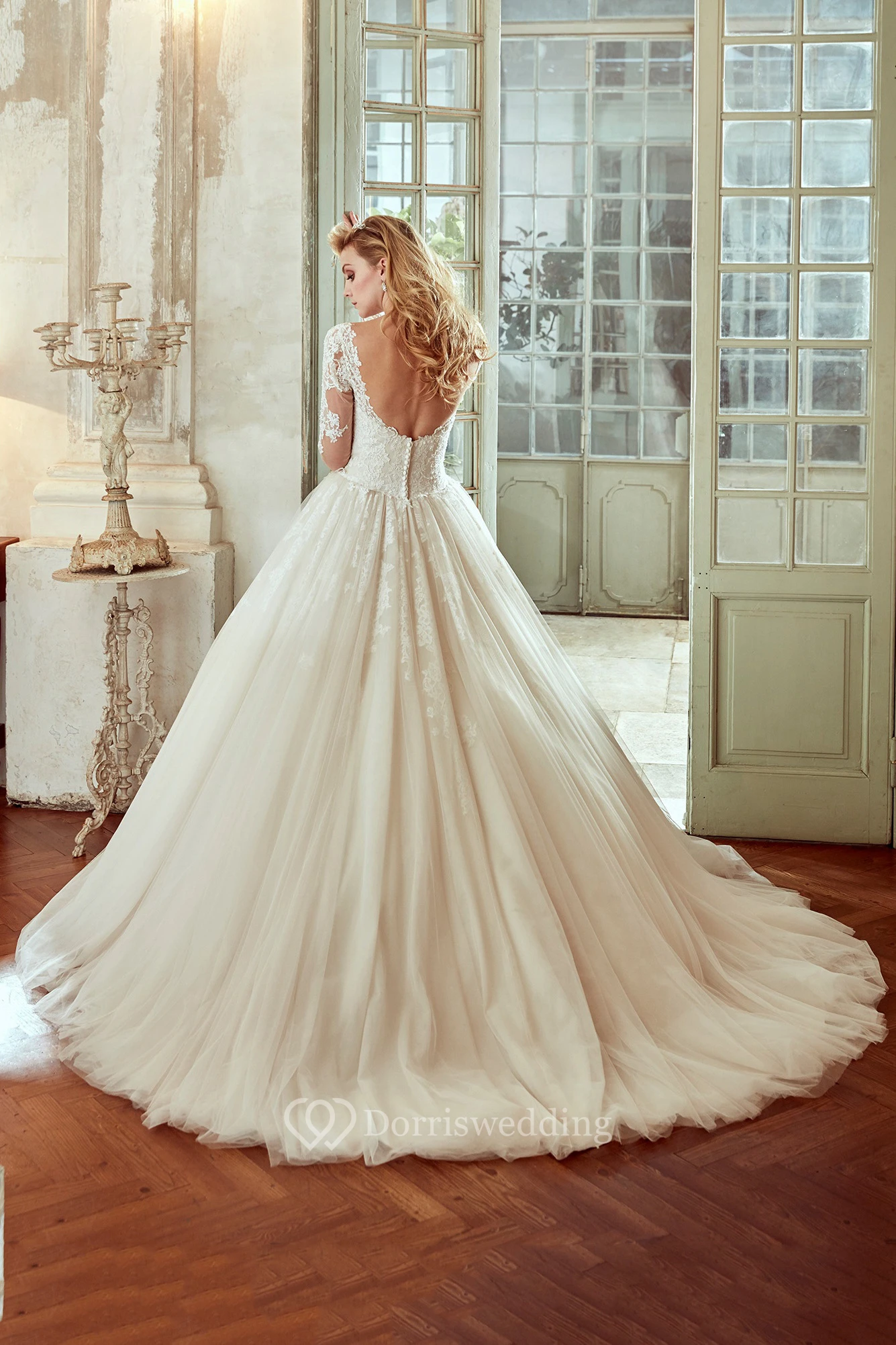 Long-Sleeve V-Neck Wedding Dress With Pleated Skirt And Open Back