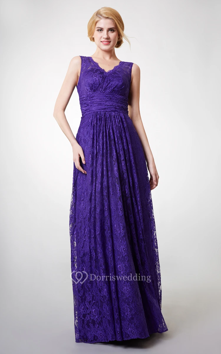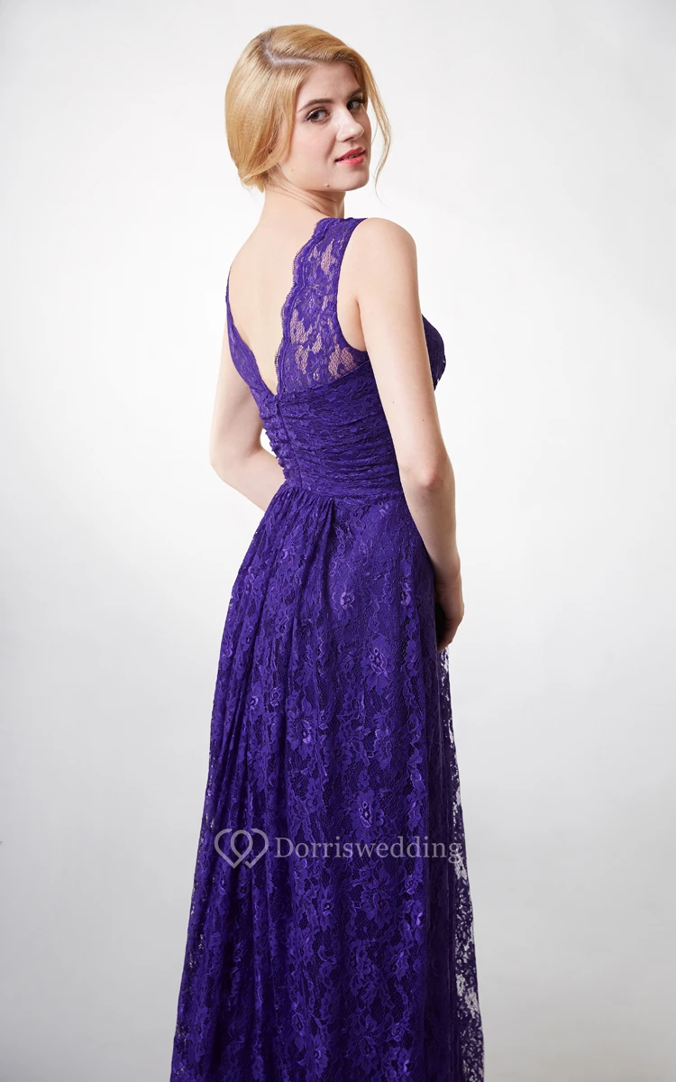 Long Sleeveless V-neck Sheath Lace Bridesmaid Dress