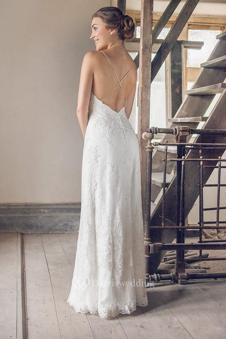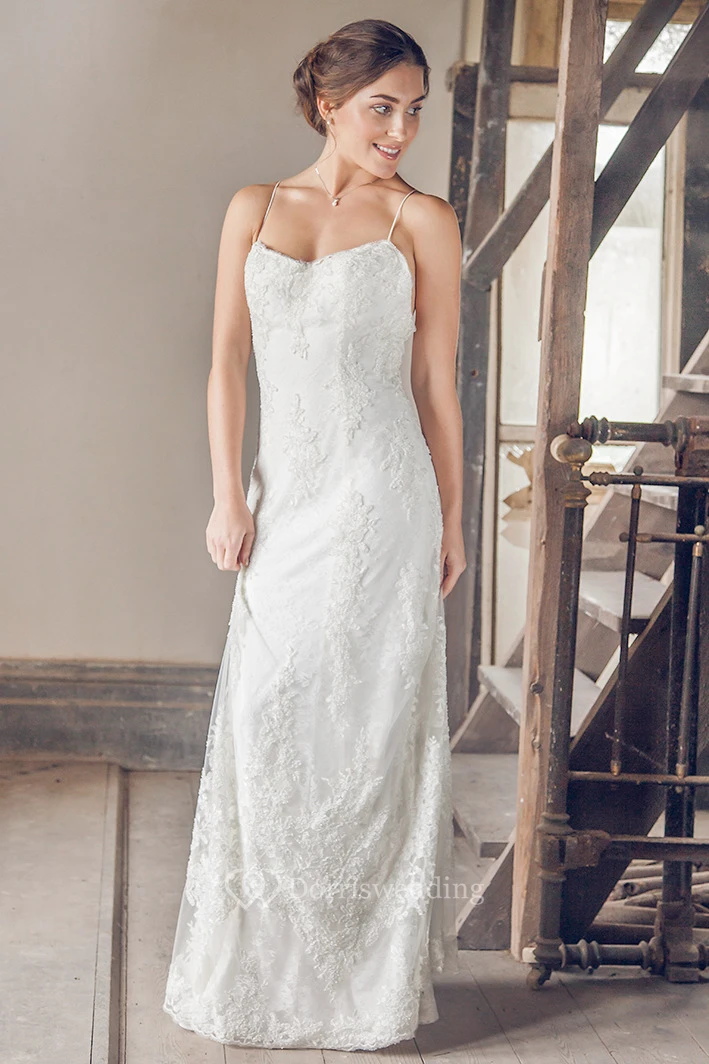 Long Spaghetti Sleeveless Appliqued Lace Wedding Dress