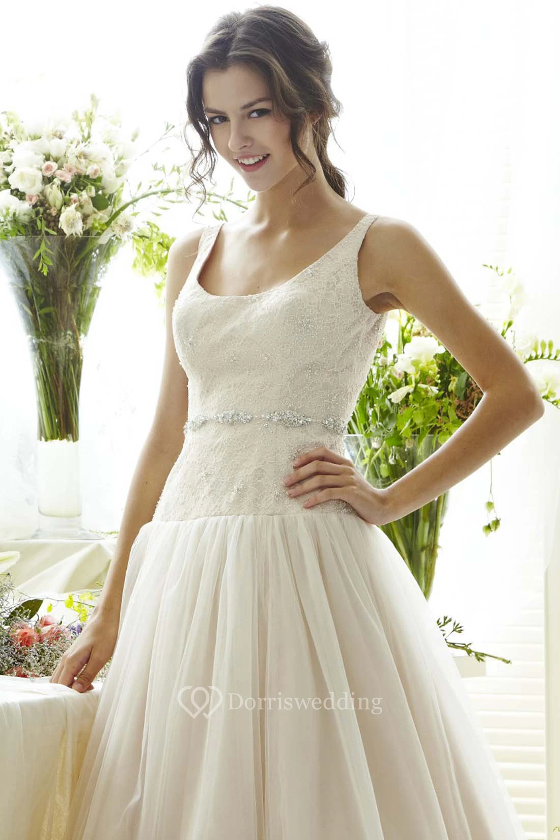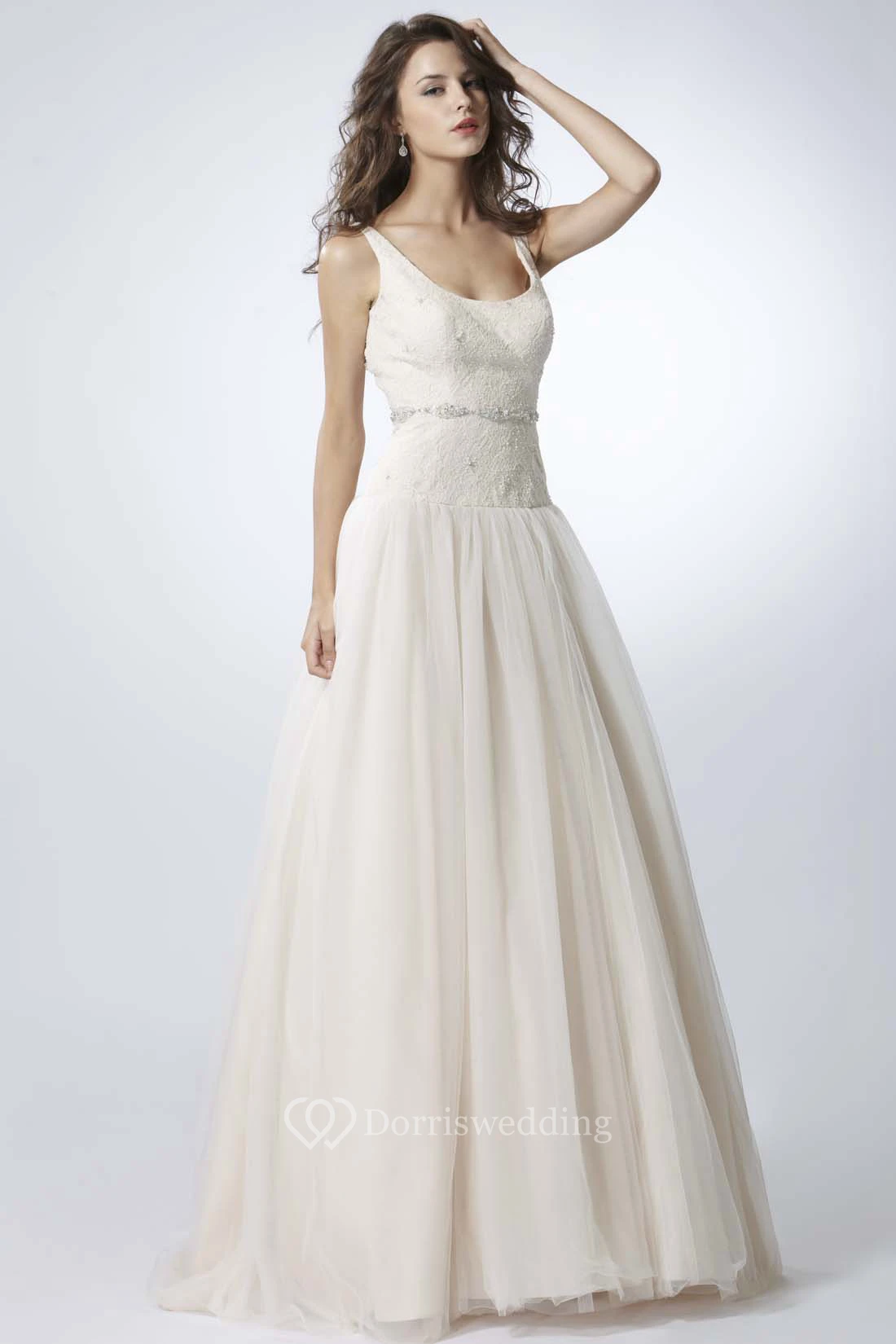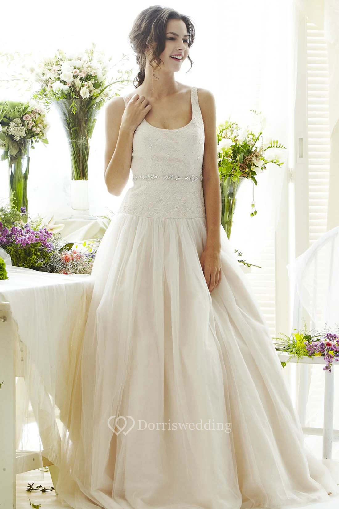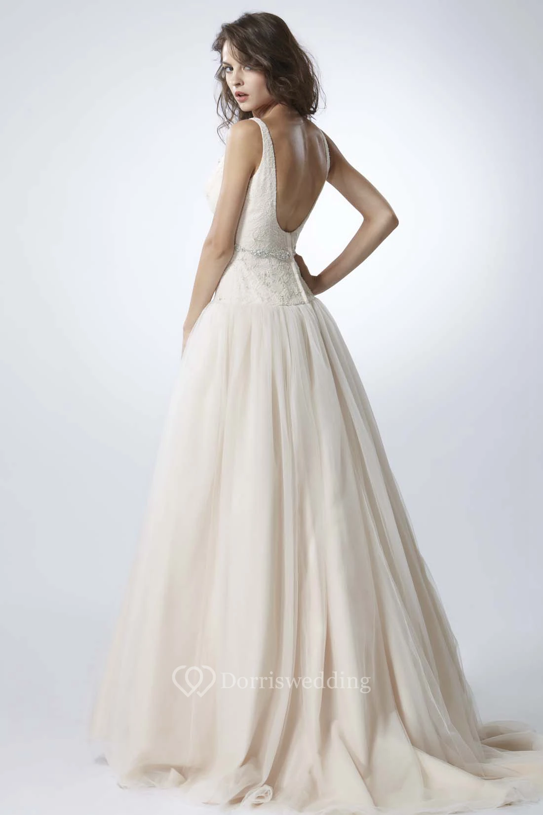 Long Square Jeweled Tulle Wedding Dress With Sweep Train And V Back