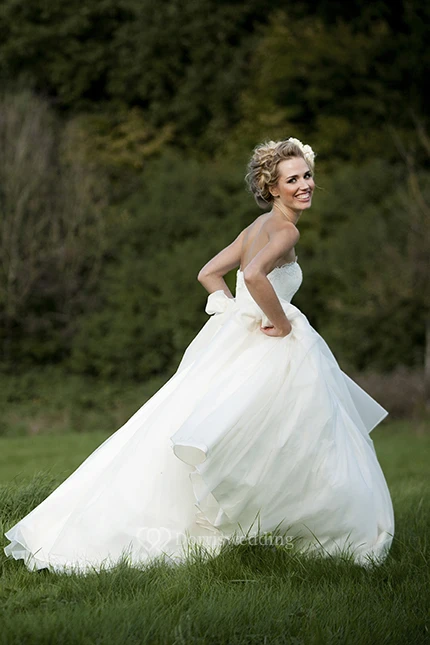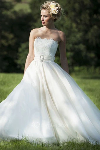 Long Strapless Appliqued Chiffon Wedding Dress With Sweep Train And V Back