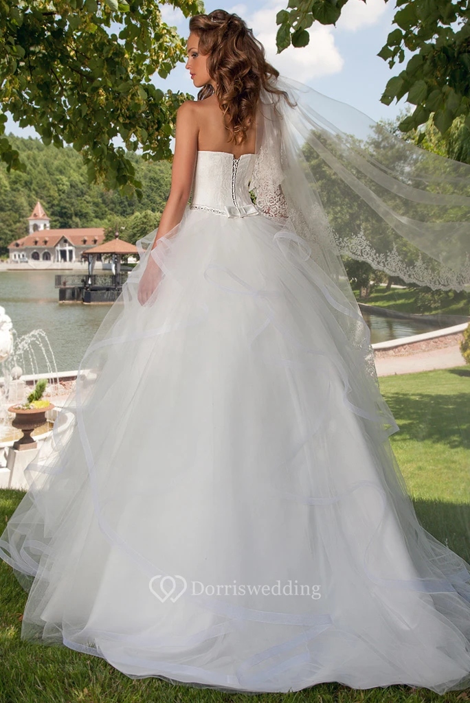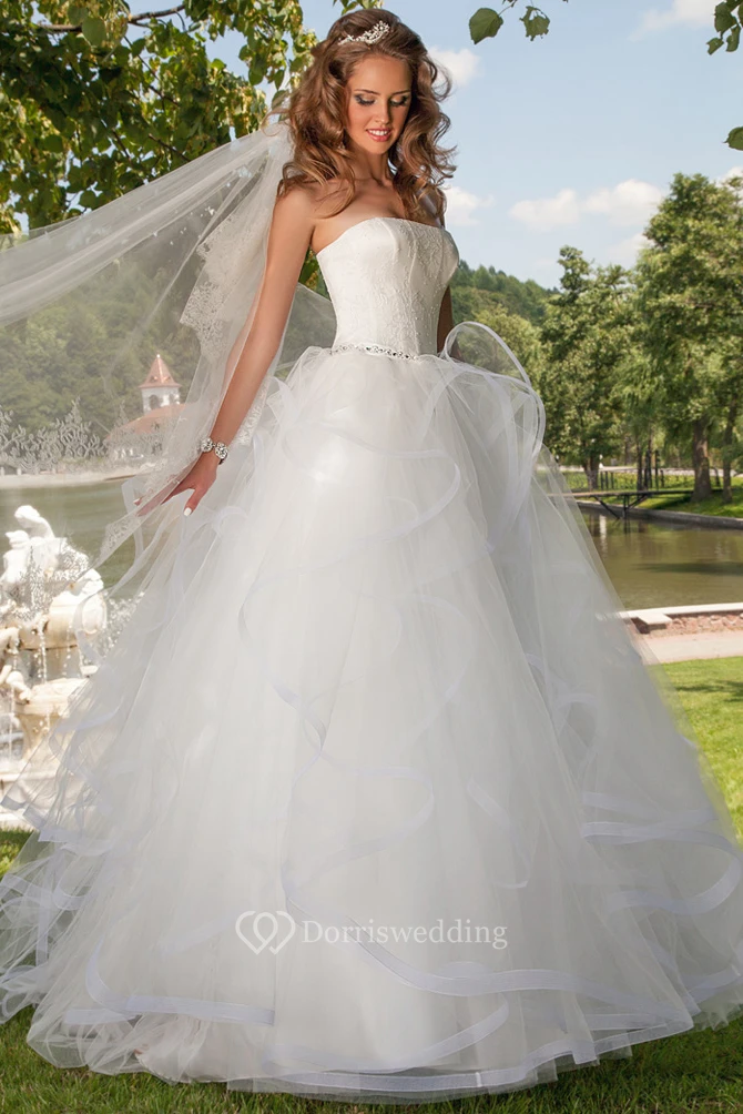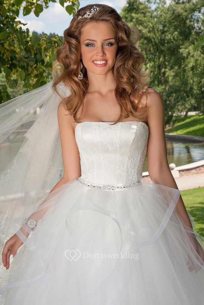 Long Strapless Appliqued Draped Tulle Wedding Dress