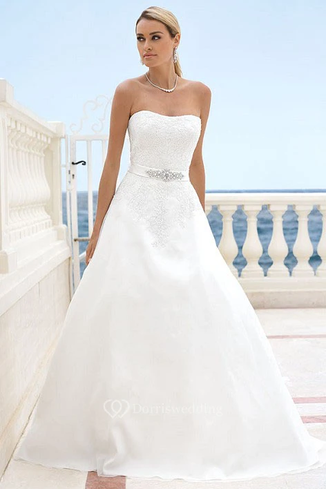 Long Strapless Appliqued Satin Wedding Dress With Waist Jewellery