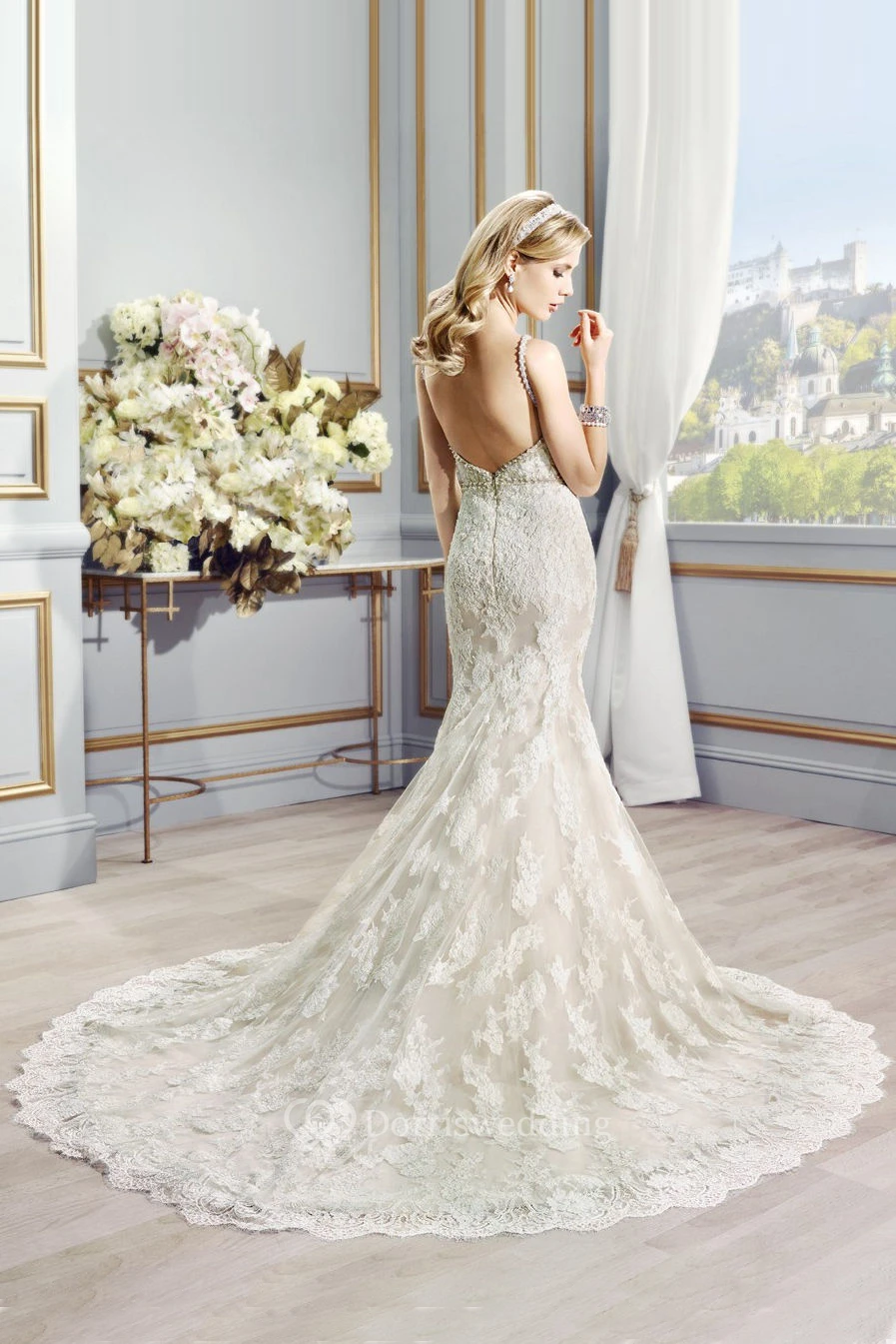 Long Straps Beaded Lace Wedding Dress With Court Train And V Back