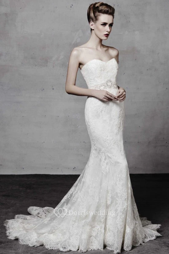 Long Sweetheart Appliqued Lace Wedding Dress With Waist Jewellery