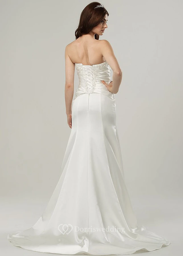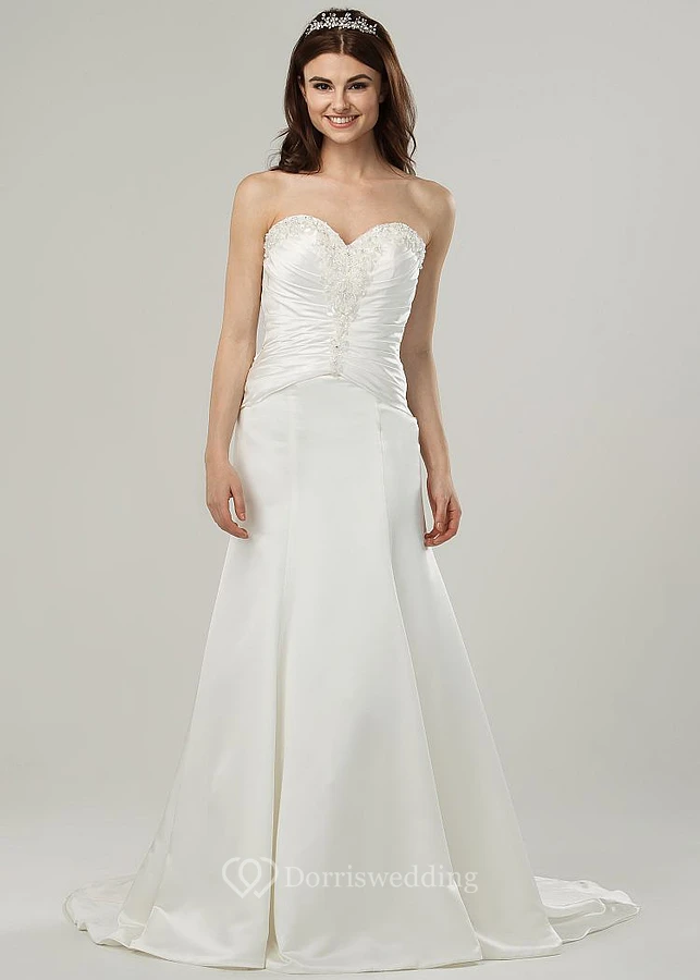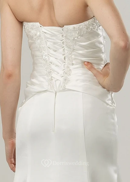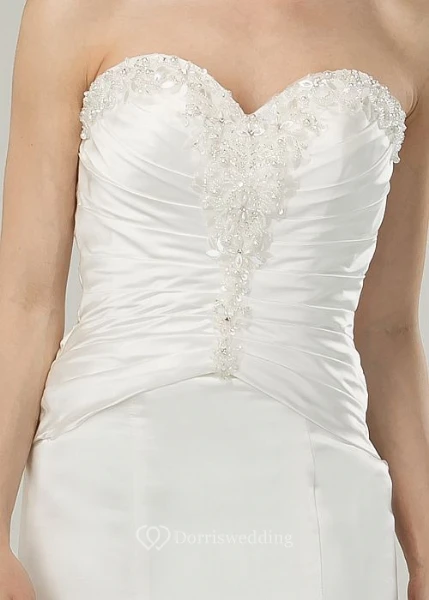 Long Sweetheart Ruched Satin Wedding Dress With Sweep Train And Corset Back