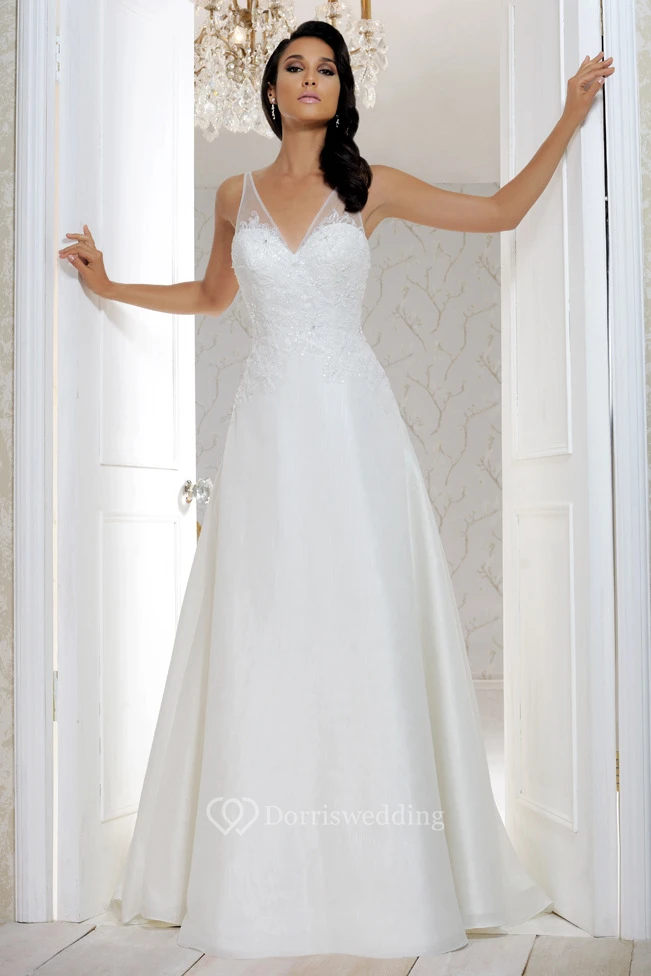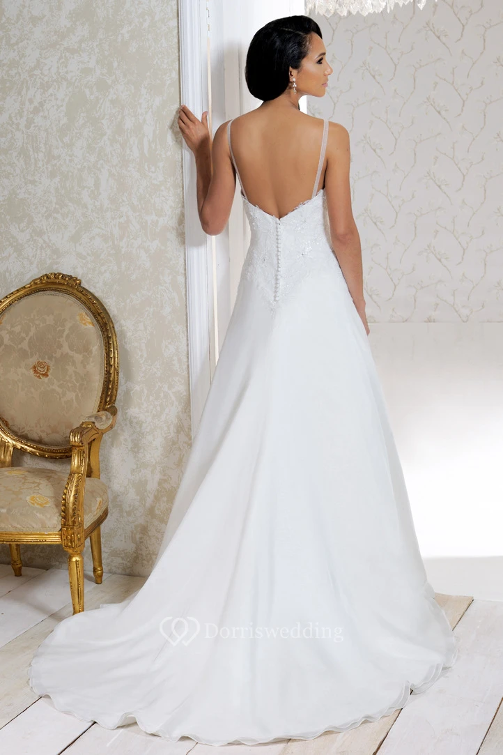 Long V-Neck Appliqued Chiffon Wedding Dress With Court Train And V Back