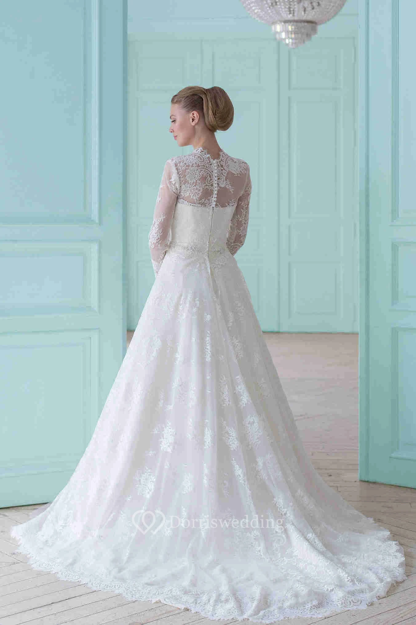 Long V-Neck Appliqued Long-Sleeve Lace Wedding Dress With Court Train And Illusion
