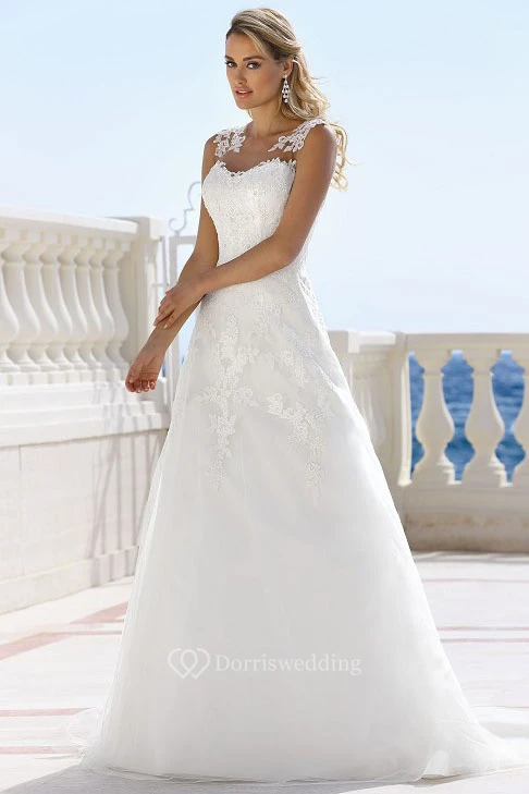 Long V-Neck Appliqued Sleeveless Satin Wedding Dress