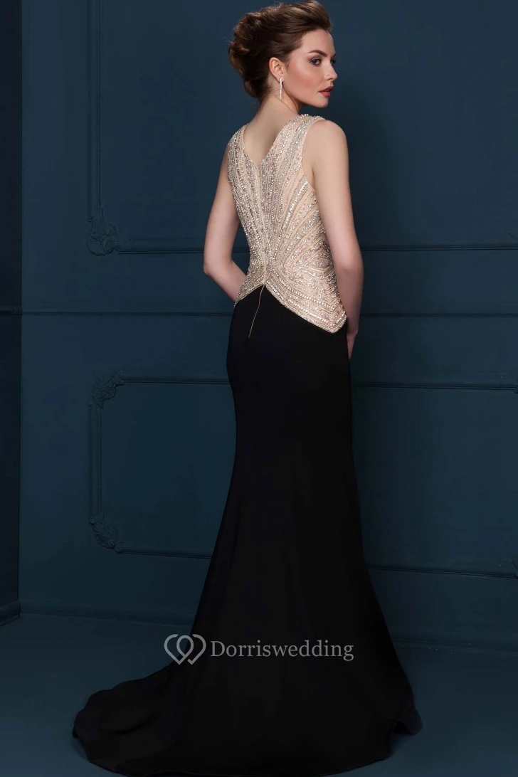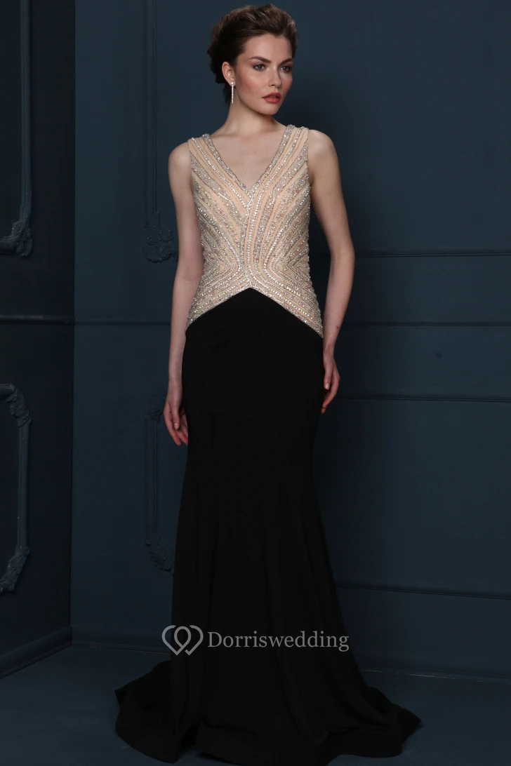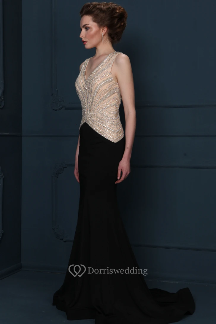 Long V-Neck Beaded Jersey Evening Dress With Sweep Train And V Back