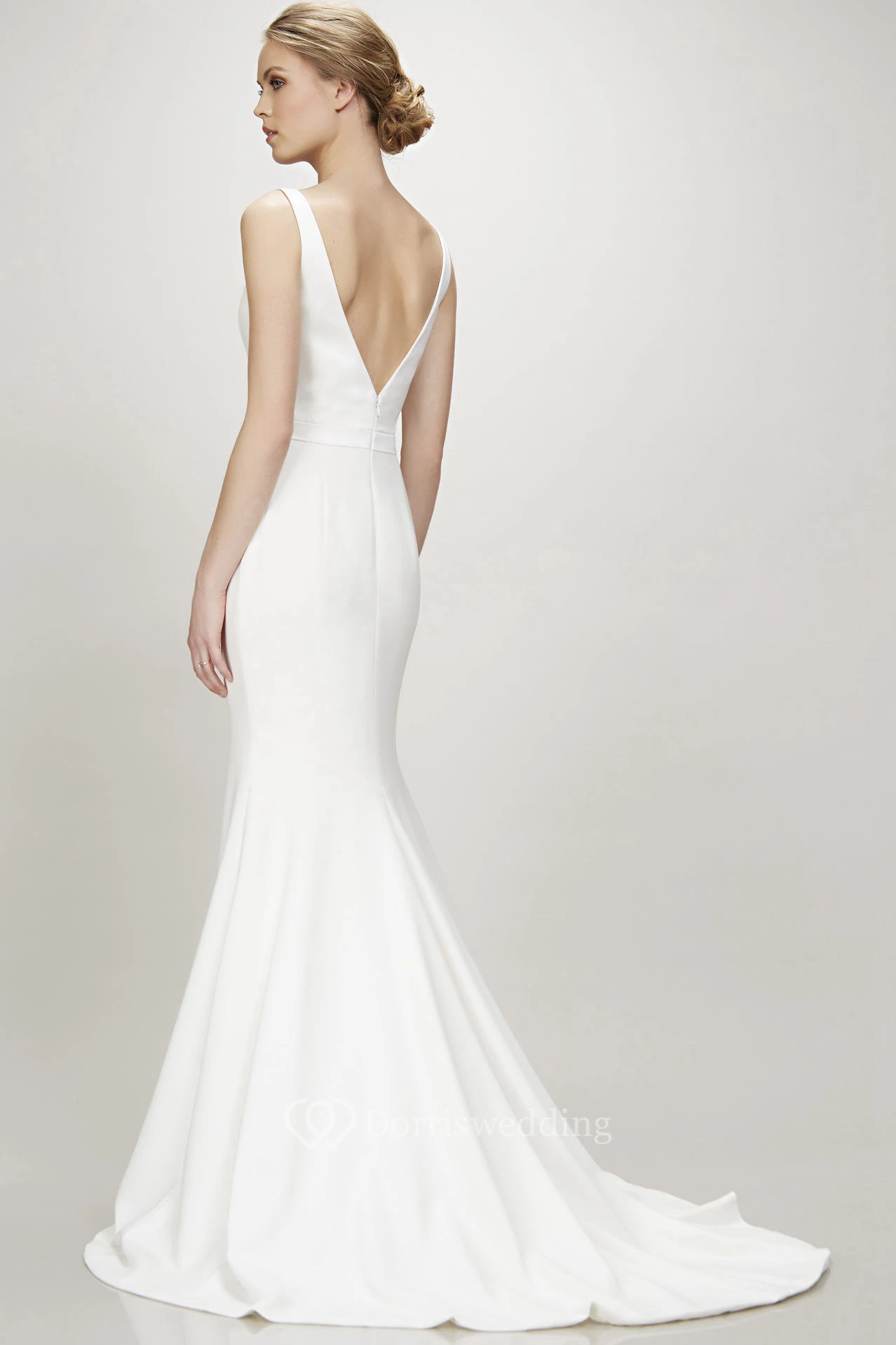 Long V-Neck Simple Wedding Dress With Sweep Train And V Back