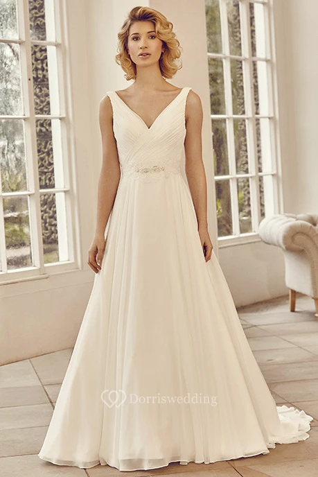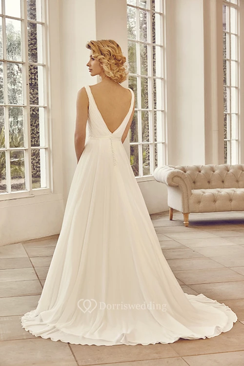Long V-Neck Criss-Cross Chiffon Wedding Dress With Court Train And V Back