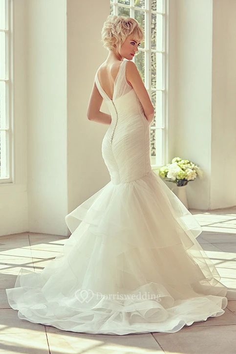 Long V-Neck Criss-Cross Tulle Wedding Dress With Court Train And V Back