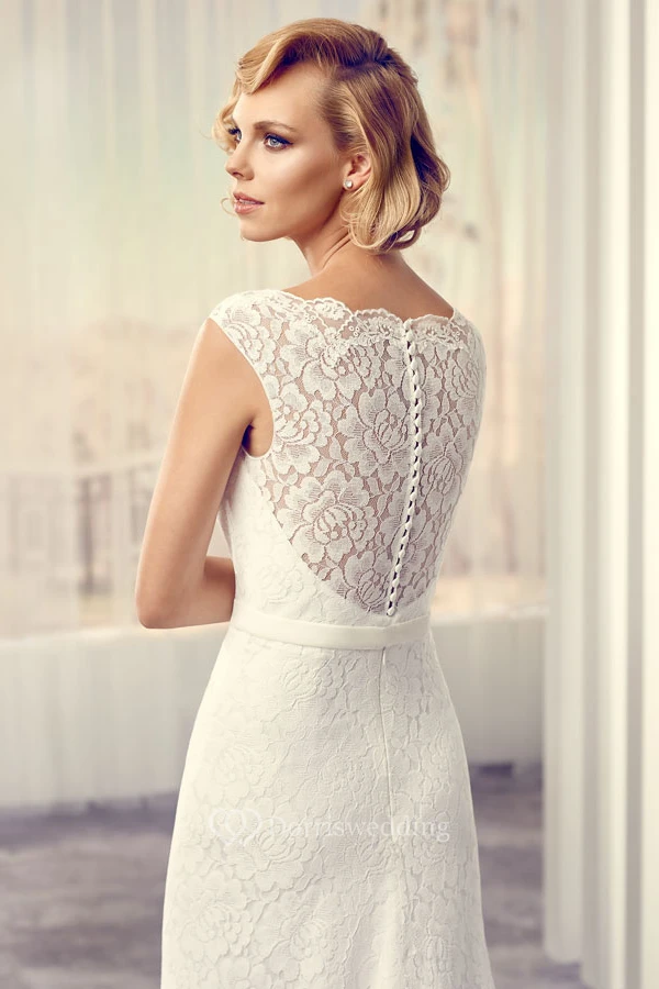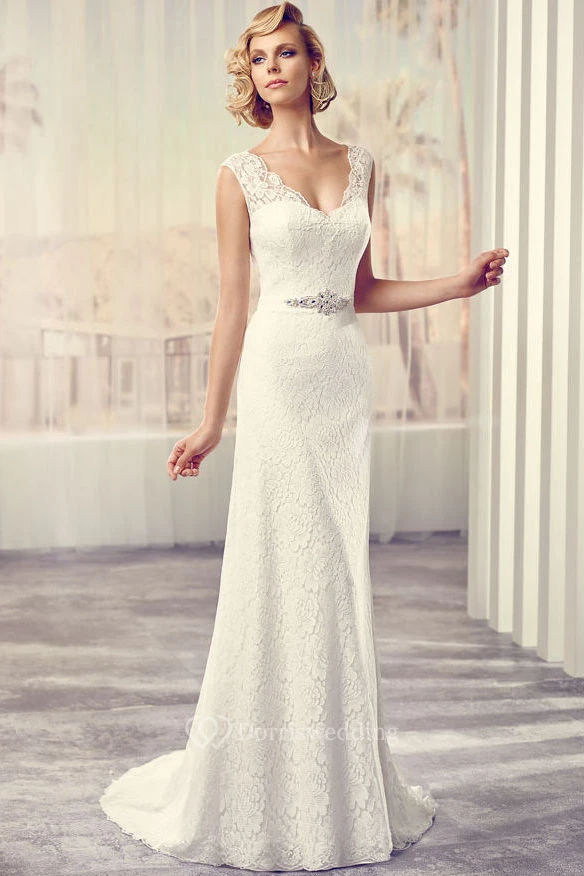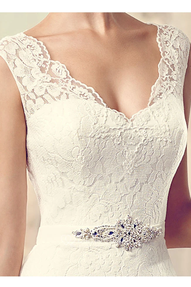 Long V-Neck Jeweled Lace Wedding Dress With Sweep Train And Illusion