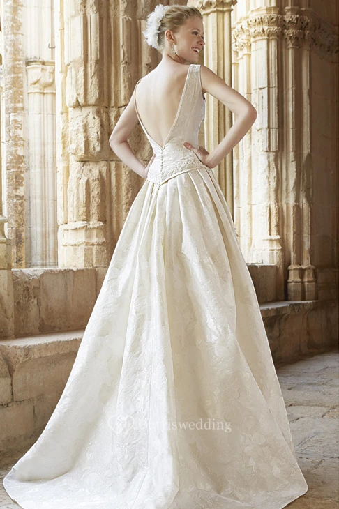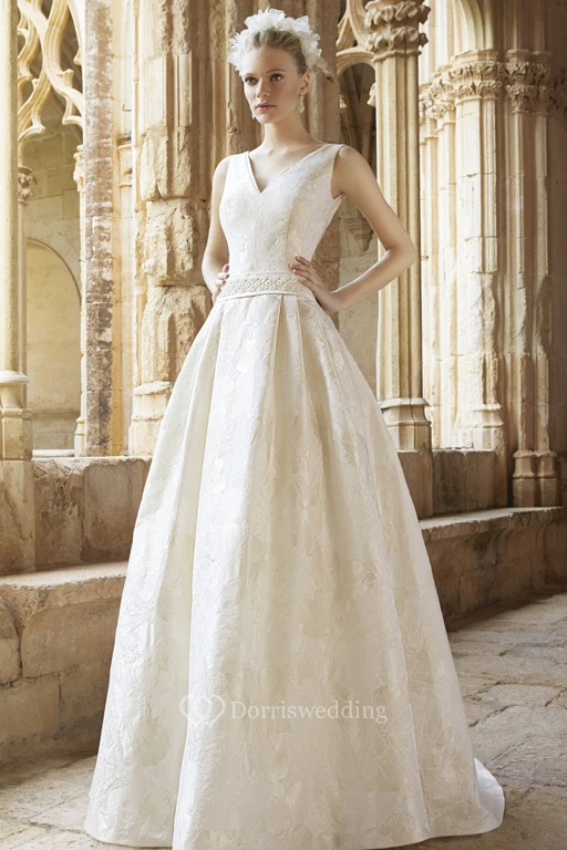 Long V-Neck Jeweled Lace Wedding Dress With Sweep Train And V Back