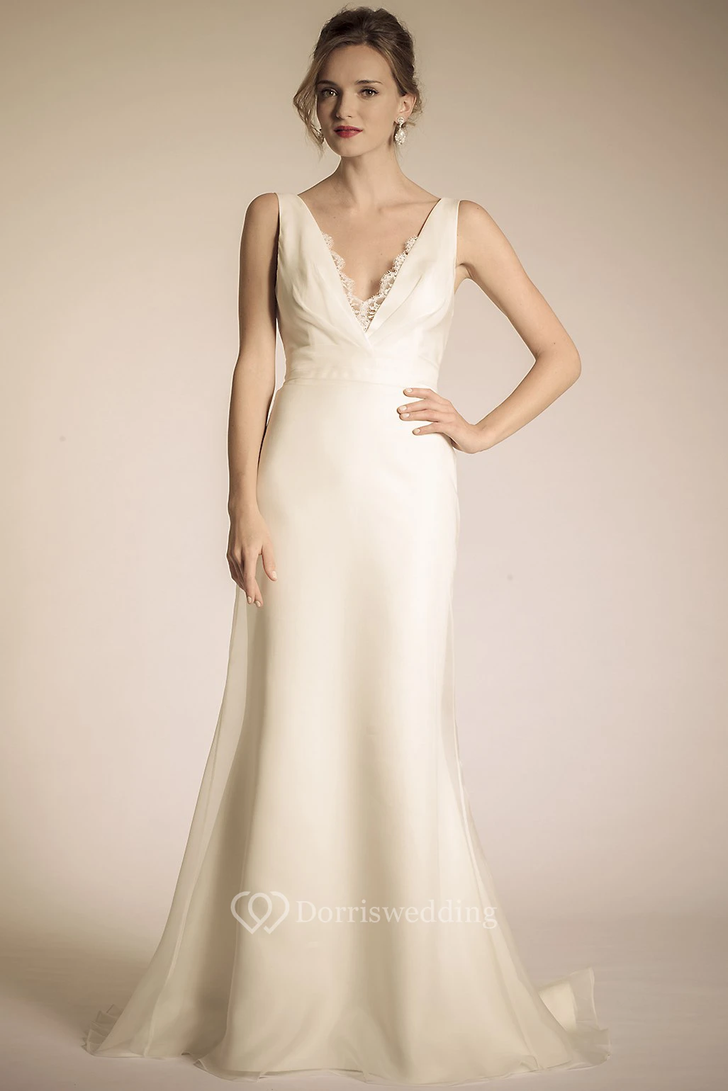 Long V-Neck Lace Tulle&Satin Wedding Dress With Court Train And V Back