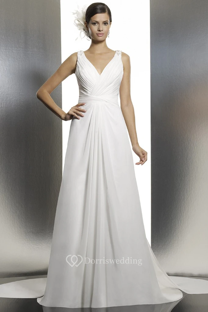 Long V-Neck Ruched Chiffon Wedding Dress With Court Train And Illusion