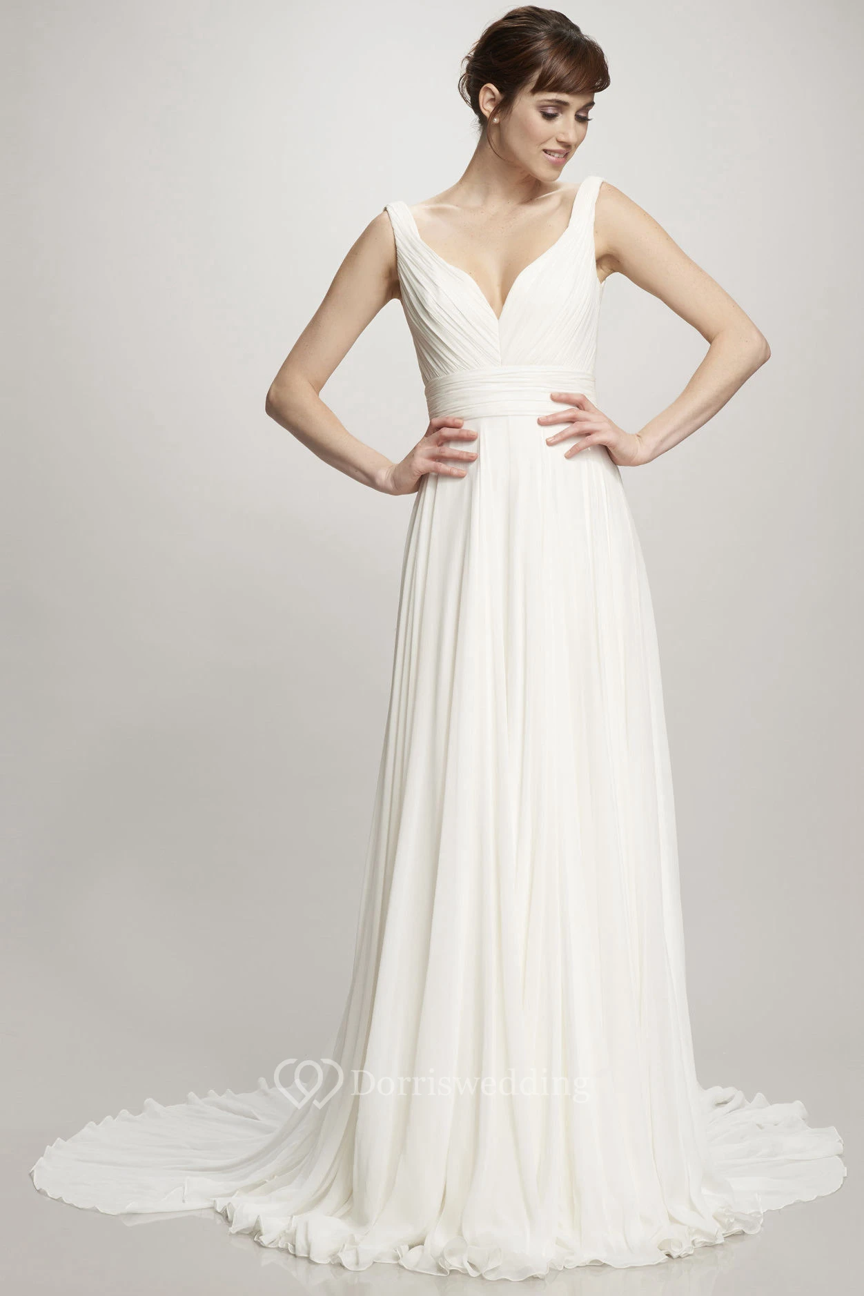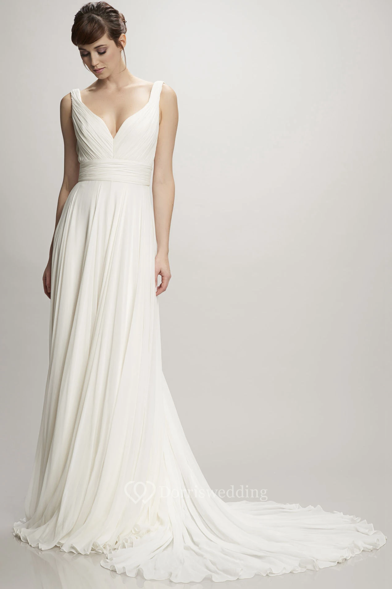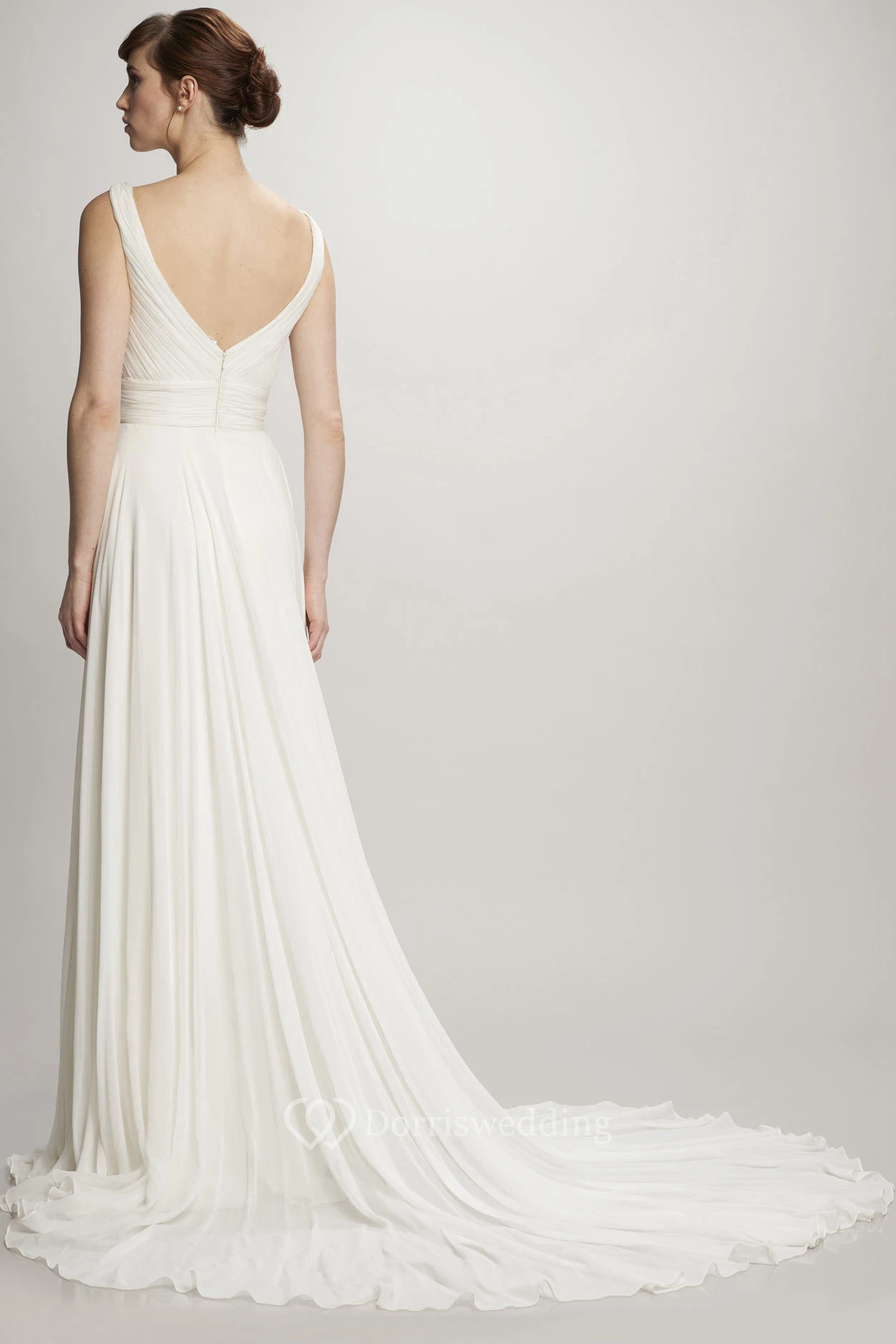 Long V-Neck Ruched Chiffon Simple Wedding Dress With Court Train And V Back