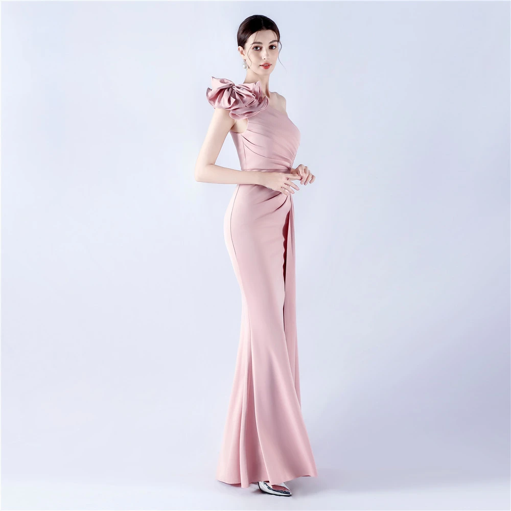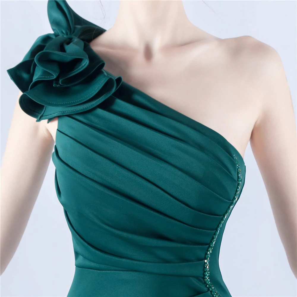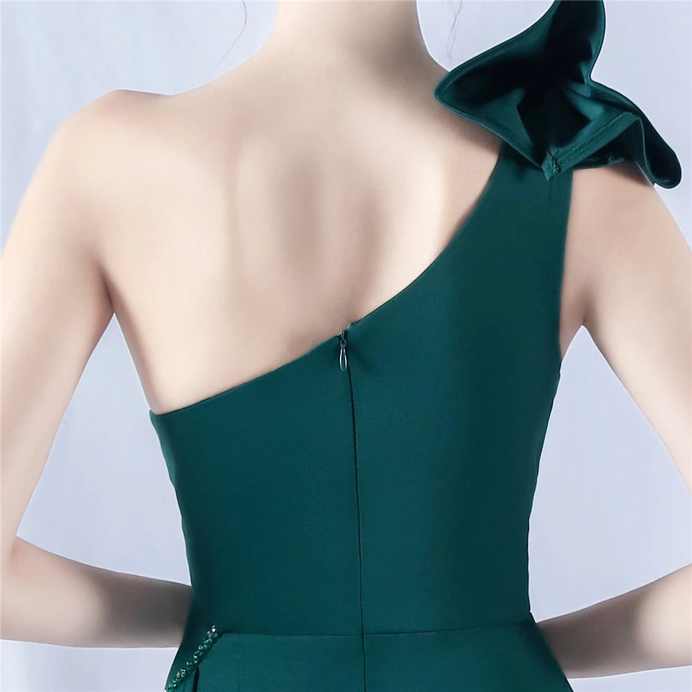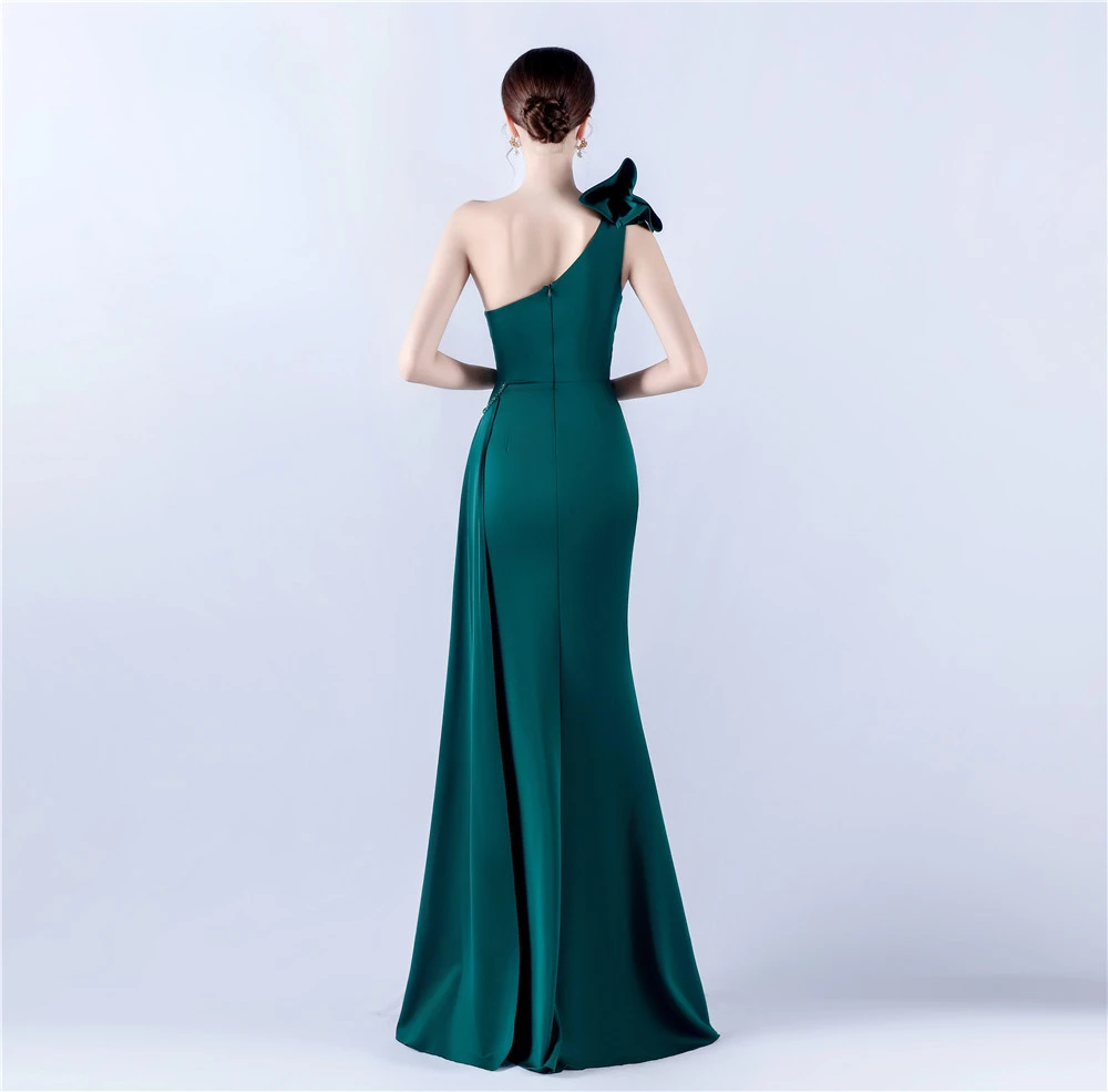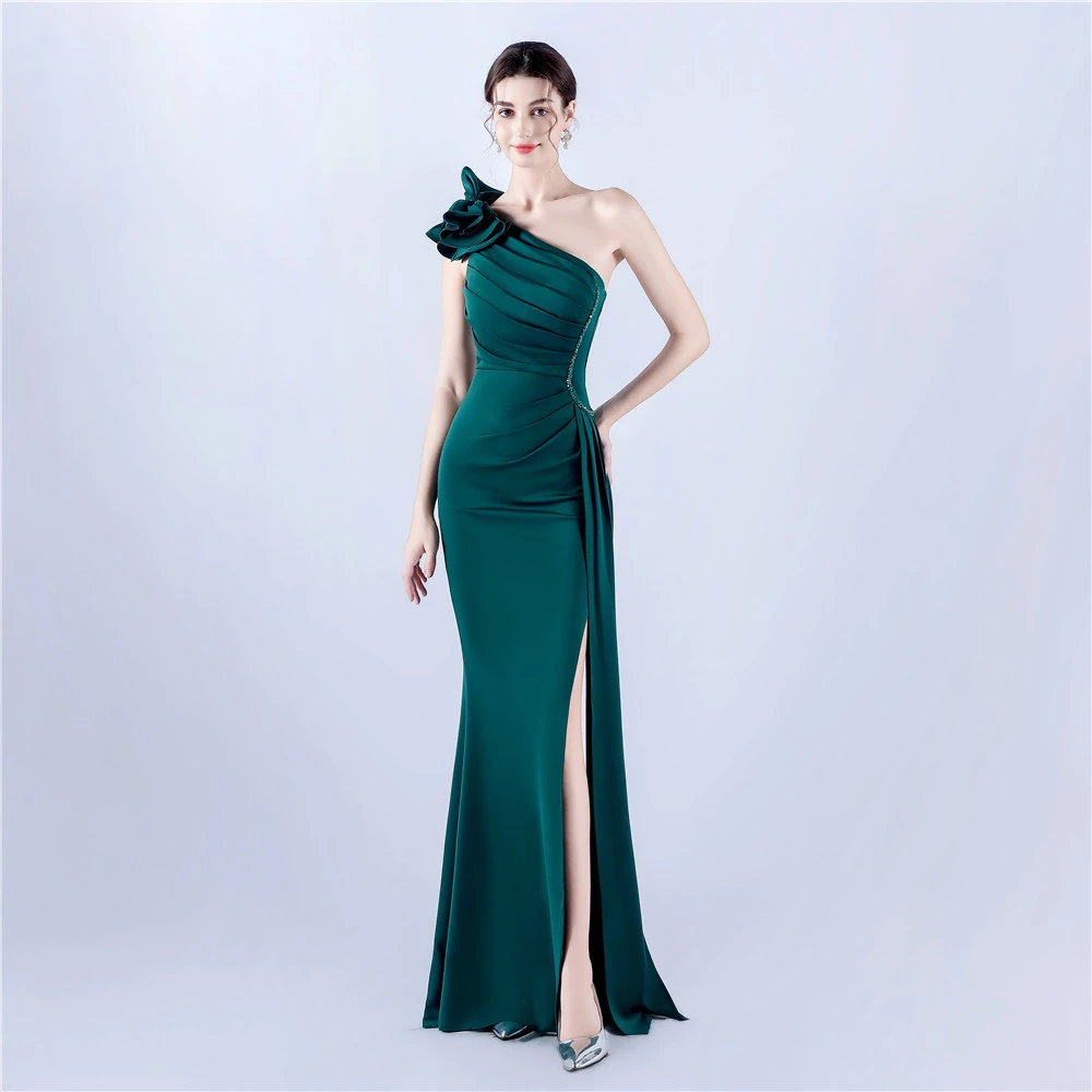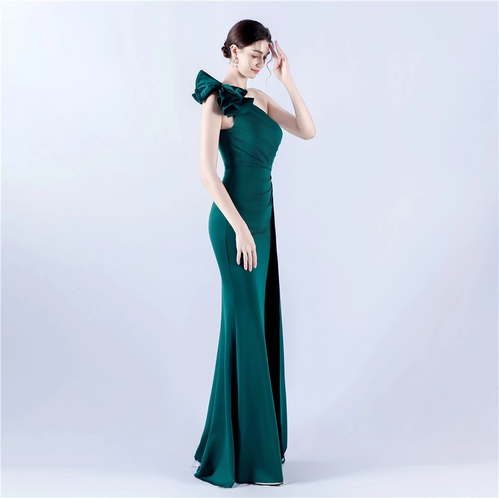 Lotus Leaf Shoulder Oblique Collar Craft Beading And Diamond-Set Evening Dress Annual Meeting Celebration