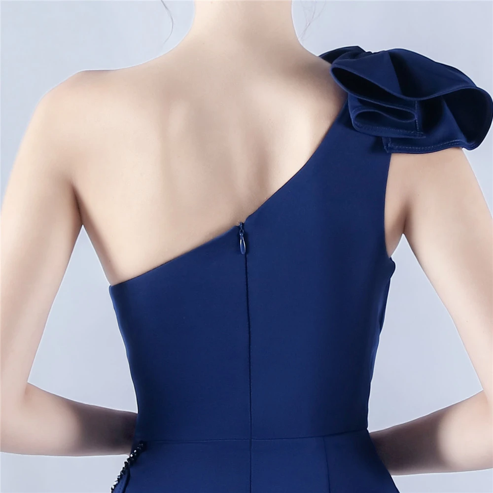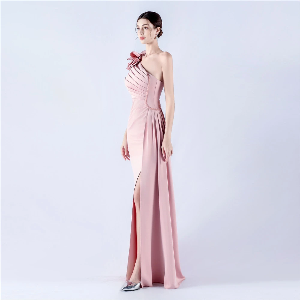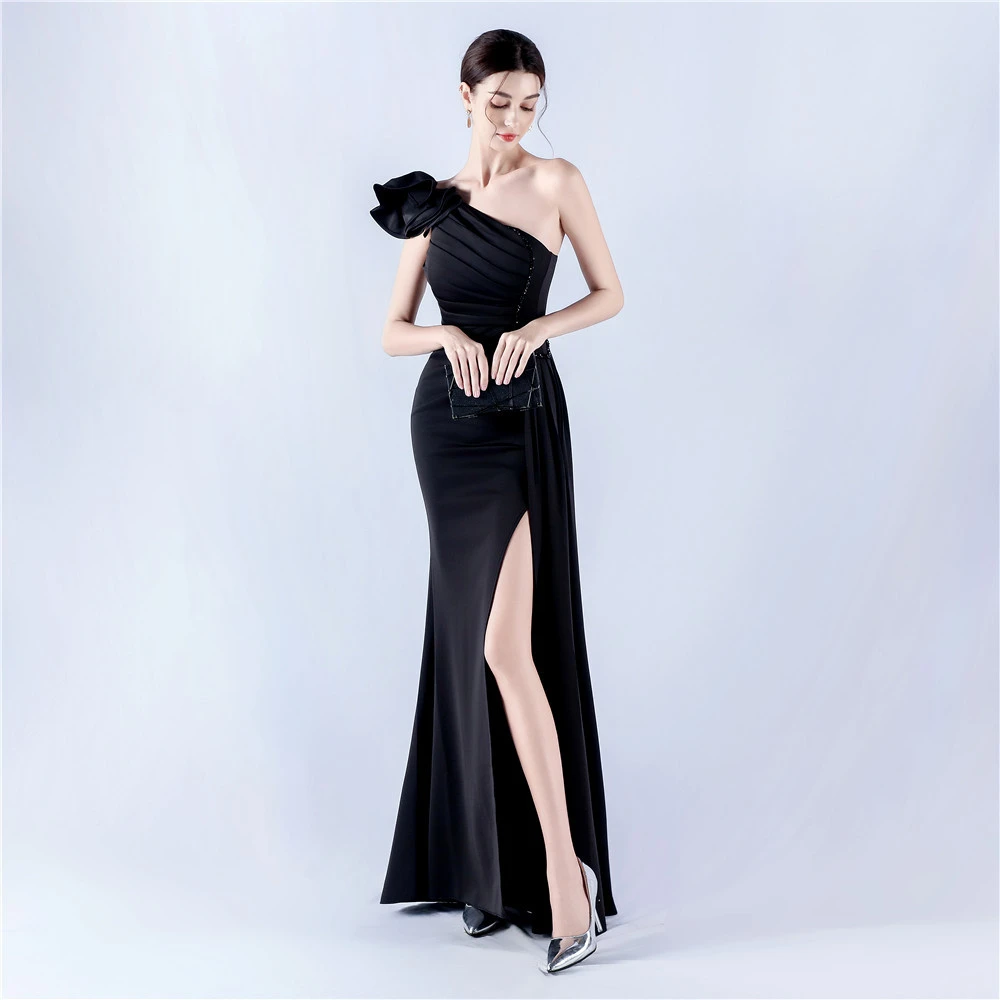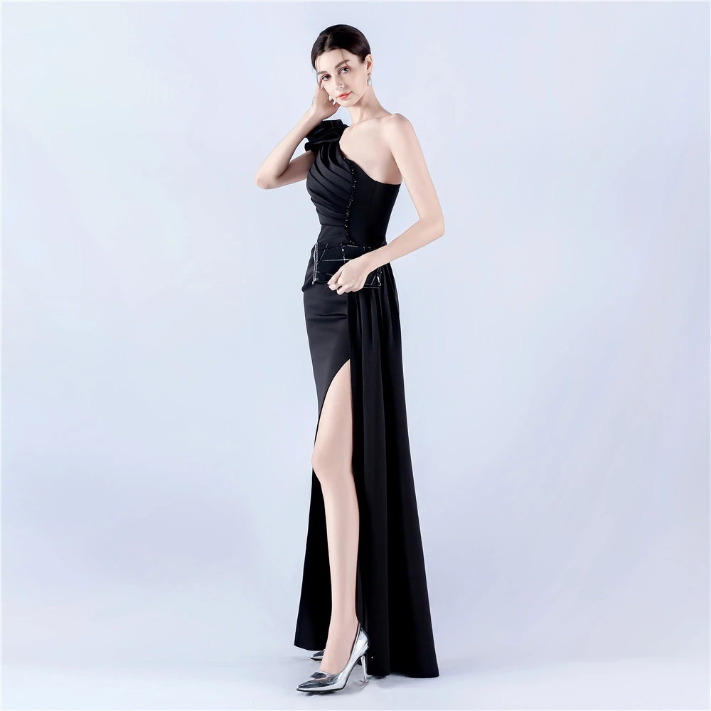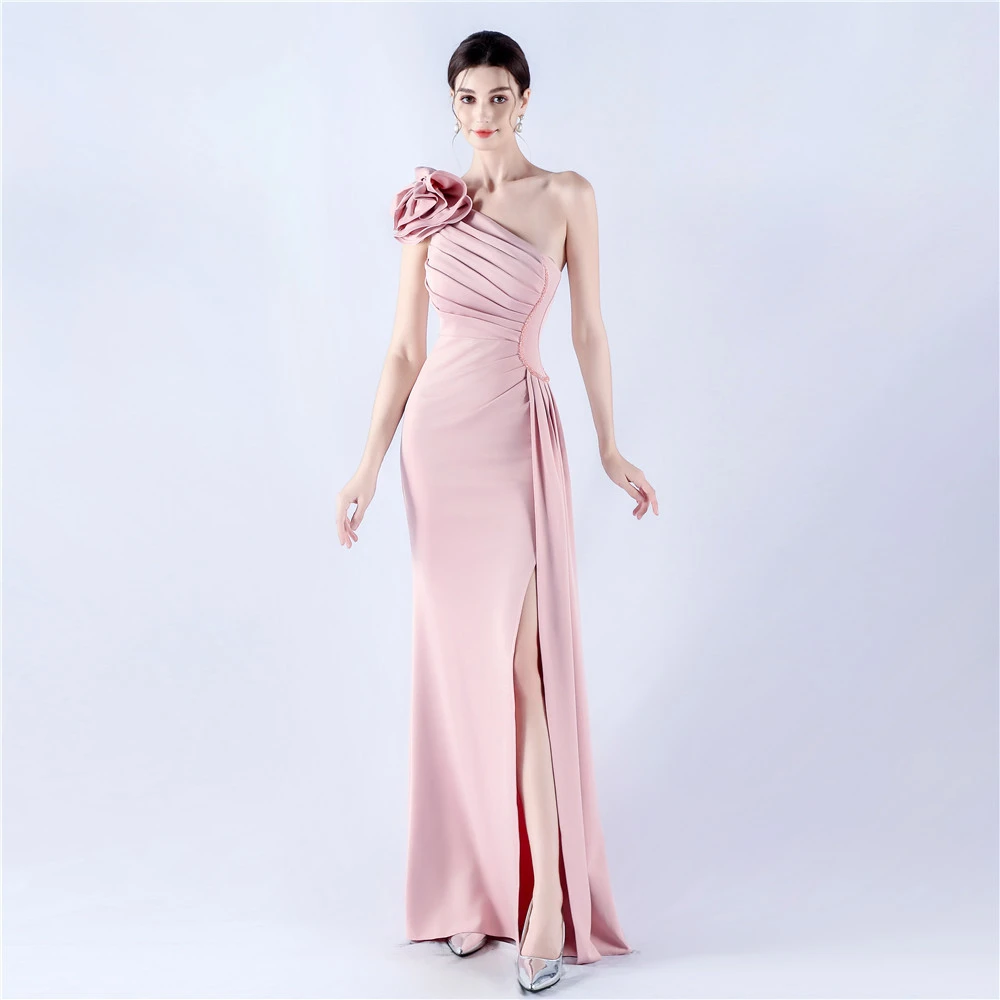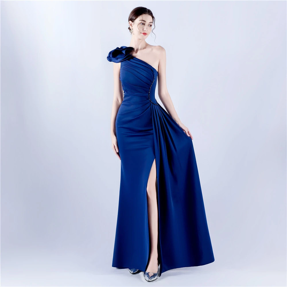 Lotus Leaf Shoulder Oblique Collar Craft Beading And Diamond-Set Evening Dress Annual Meeting Celebration