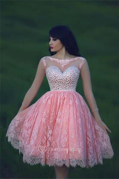 Lovely Beadings Lace Cocktail Dress Open Back Pink Homecoming Dress