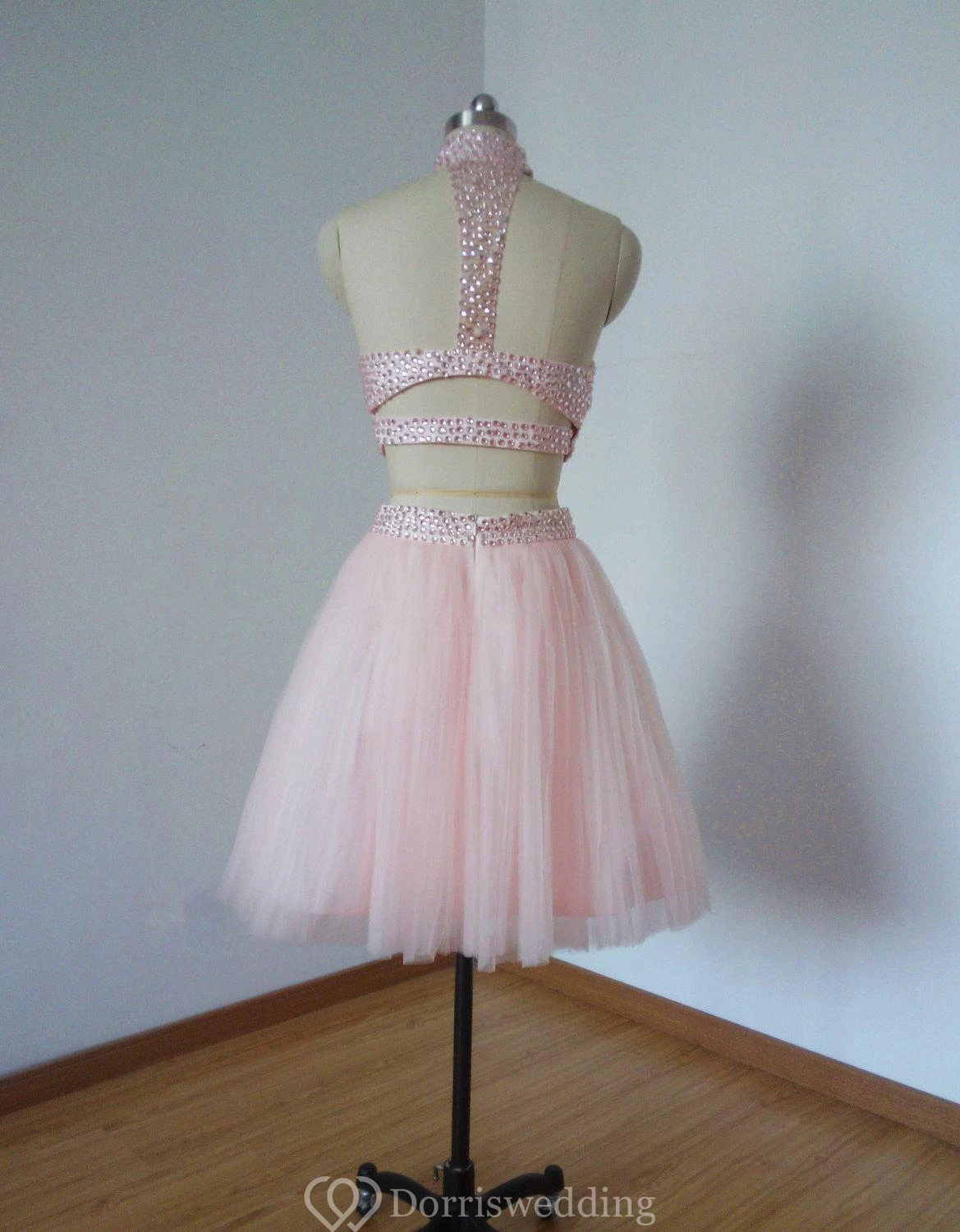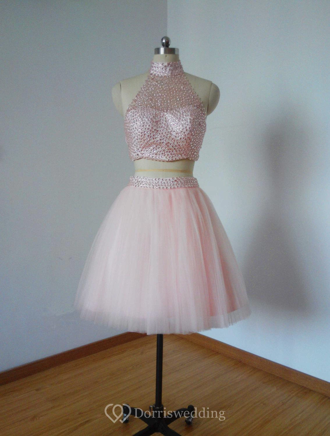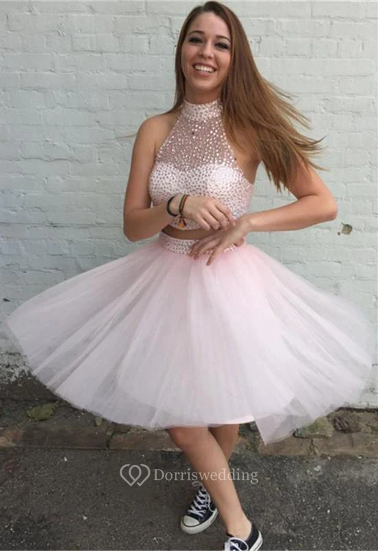 Lovely Halter Beadings Short Tulle Cocktail Dress Two Piece