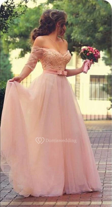 Lovely Princess Beadings Tulle Half Sleeves Long Prom Dress