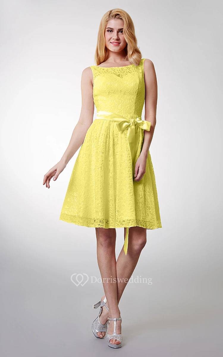 Lovely Sleeveless Short Lace Dress With Bow Sash