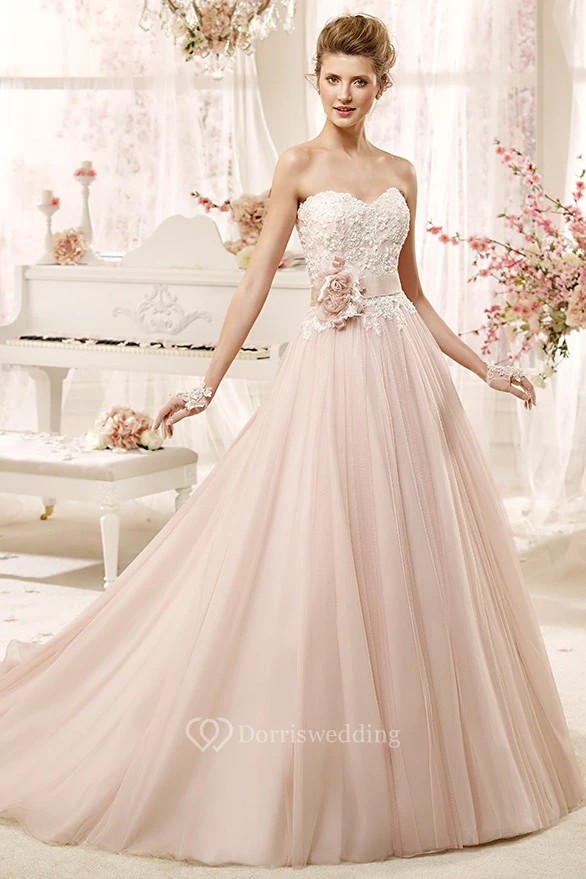 Lovely Strapless A-line Wedding Dress with Flower Sash and Pleated Skirt