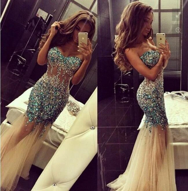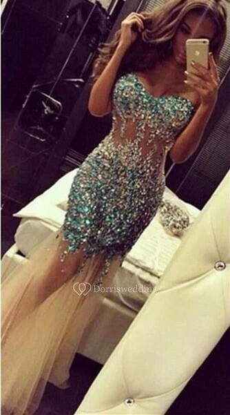 Luxurious Crystals Tulle Mermaid Prom Dress Sweep Train