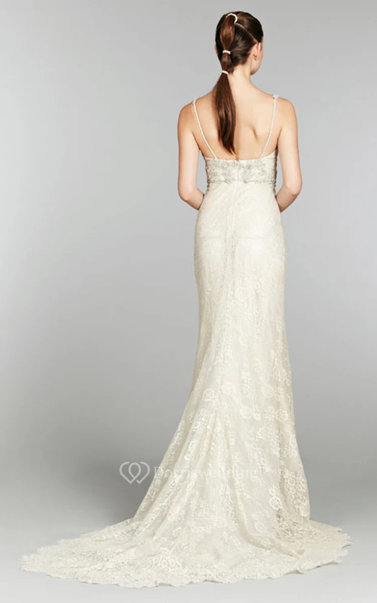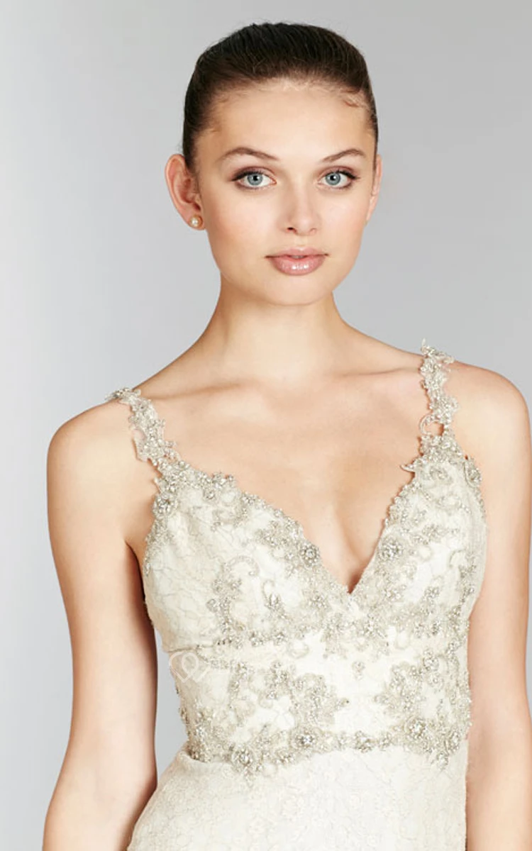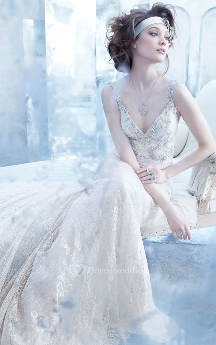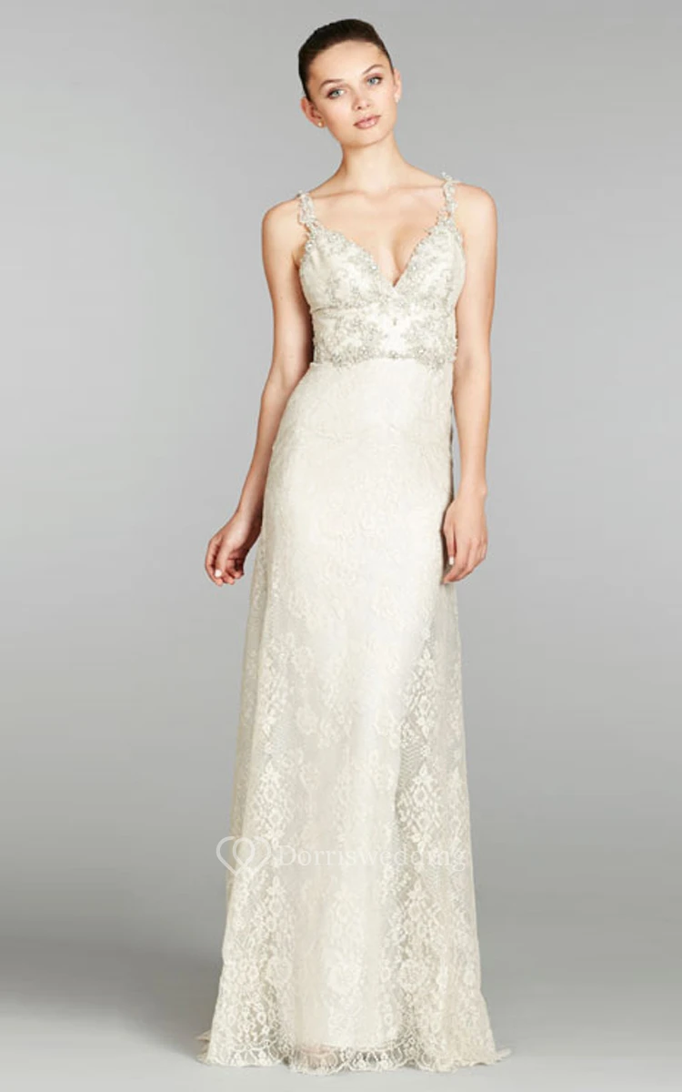Luxurious Sleeveless V-Neck Lace Champagne Bridesmaid Dress with Crystal Detailing