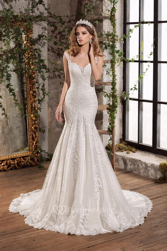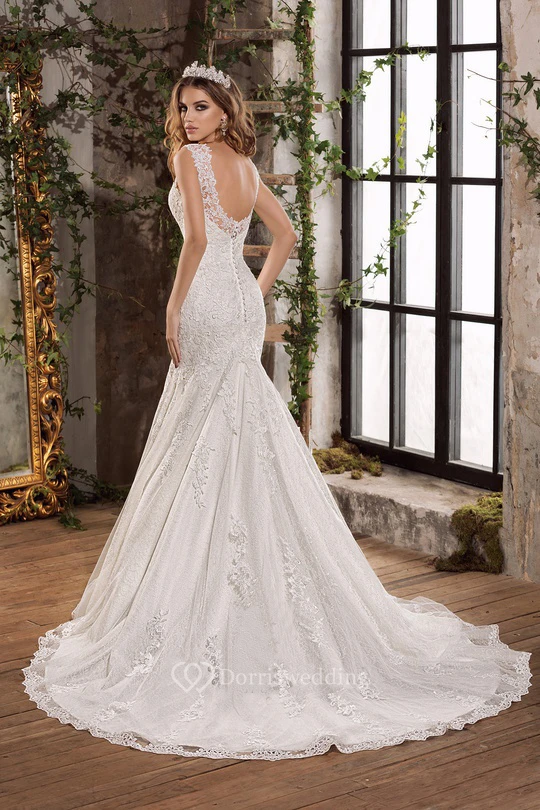 Luxury Lace and Tulle Notched Long Mermaid Wedding Dress with Applique