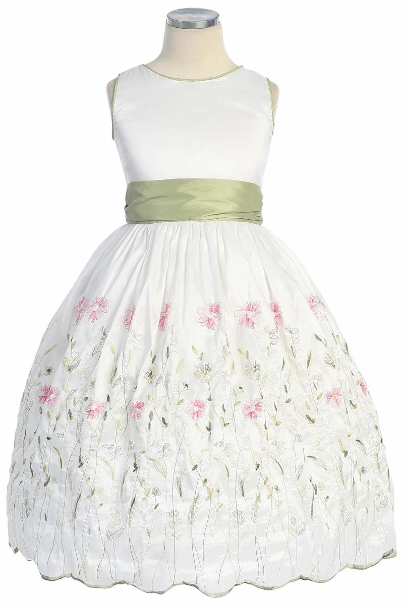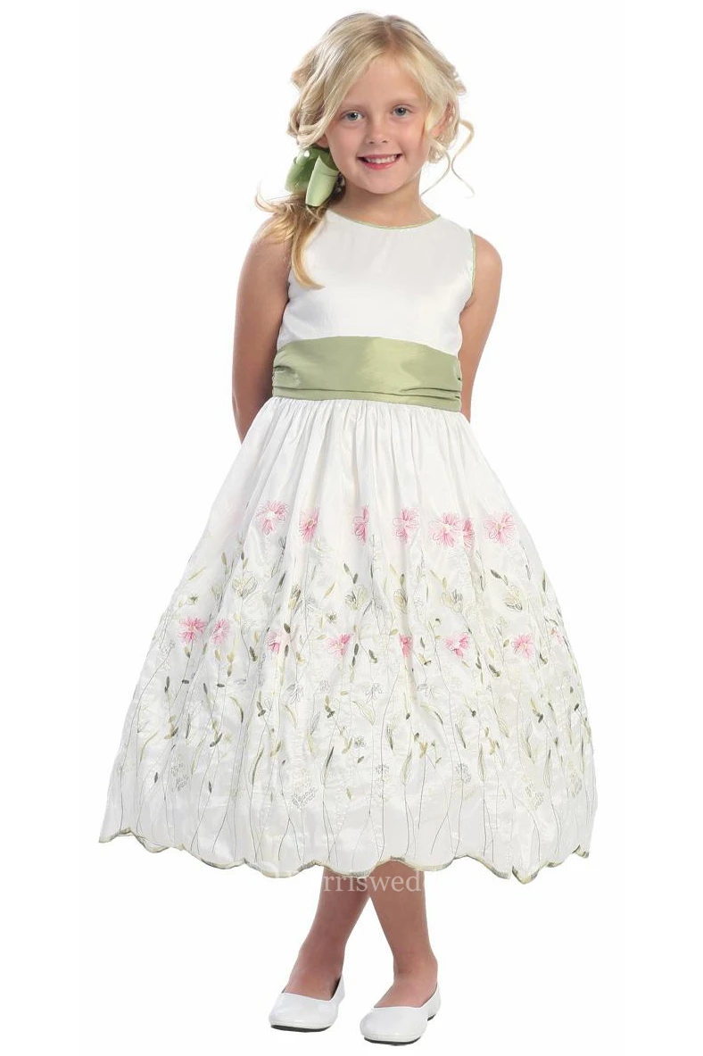 Floral Tea-Length Bowed Taffeta Flower Girl Dress With Embroidery