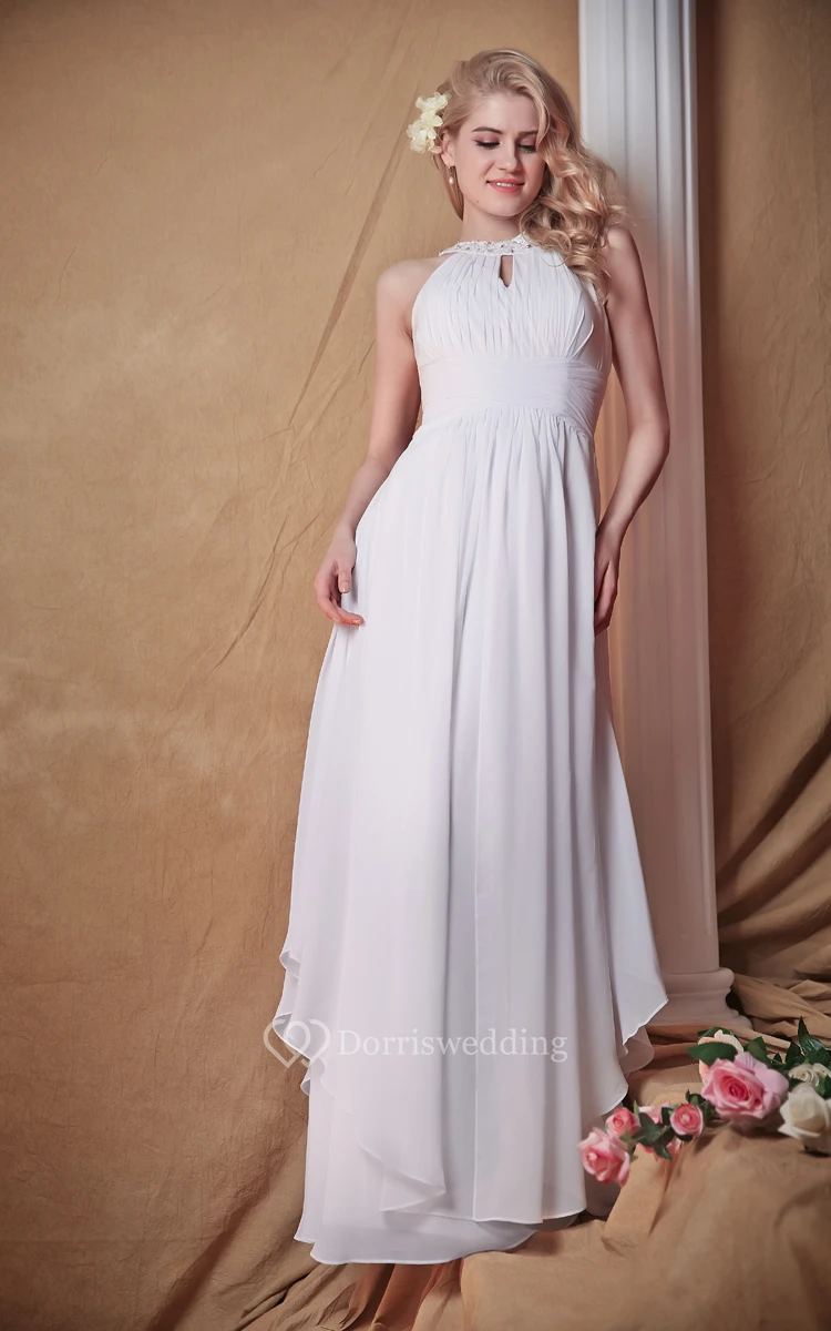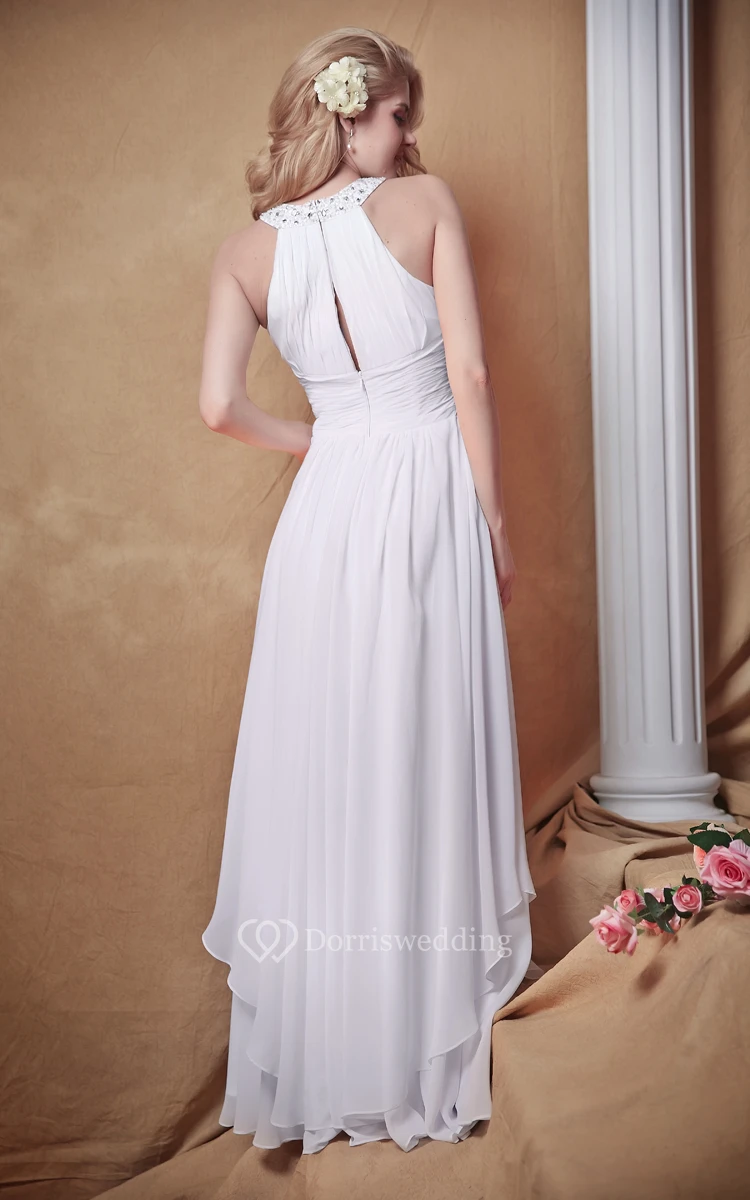 Soft chiffon full length dress with layered drapes to the sides. Vertical ruche pleats form a small keyhole cutout to the front bodice, with a similar design to the back. A fitted wide band with horizontal ruche pleating, fashions a natural waistline to this A-line silhouette. The neckline has a lovely jeweled shape and is decorated with beads.
