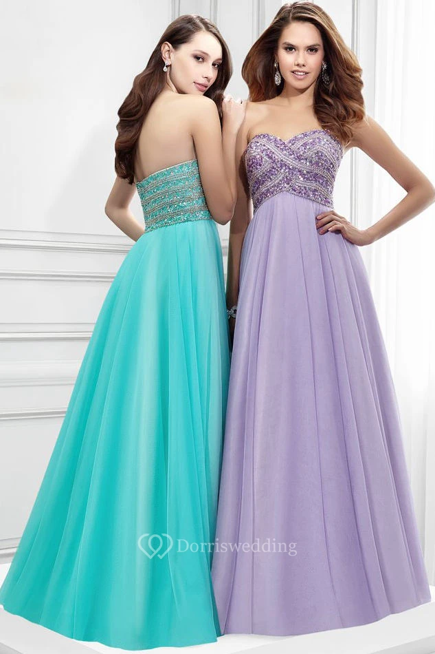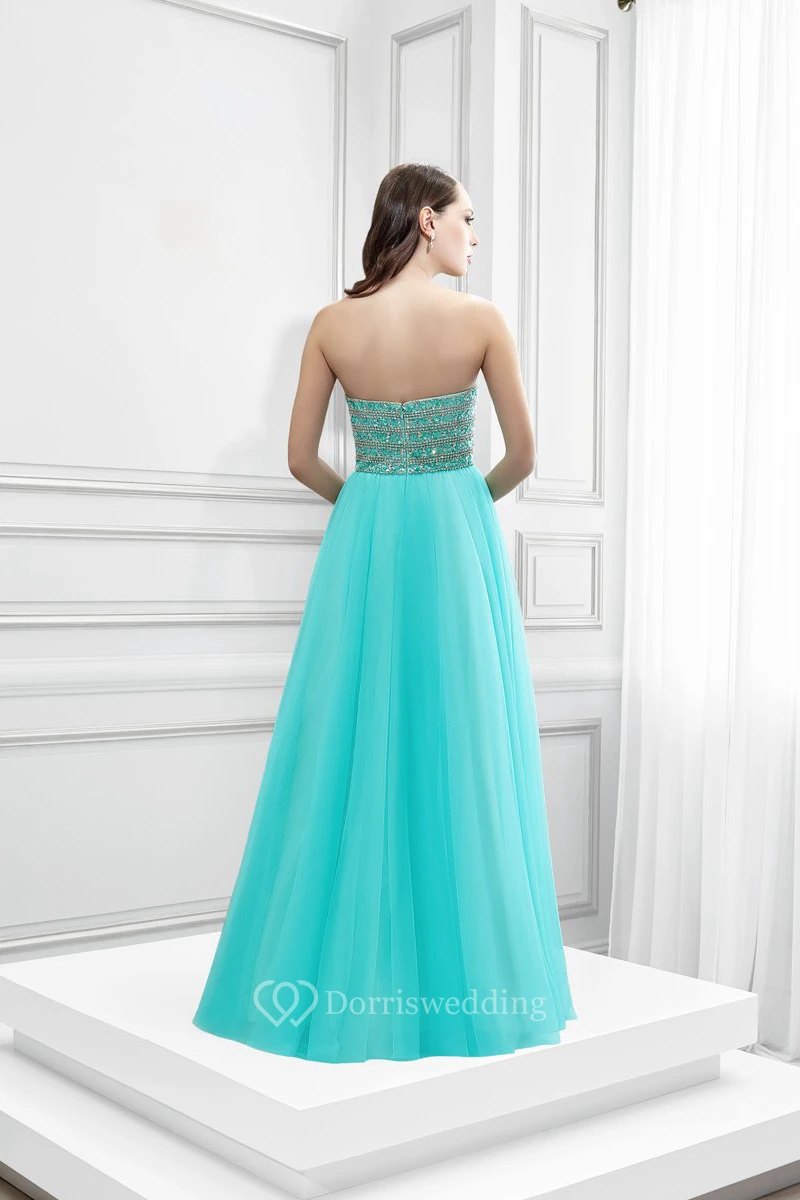 Maxi A-Line Sleeveless Beaded Sweetheart Tulle Prom Dress With Low-V Back