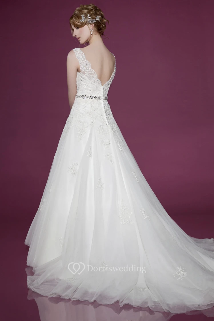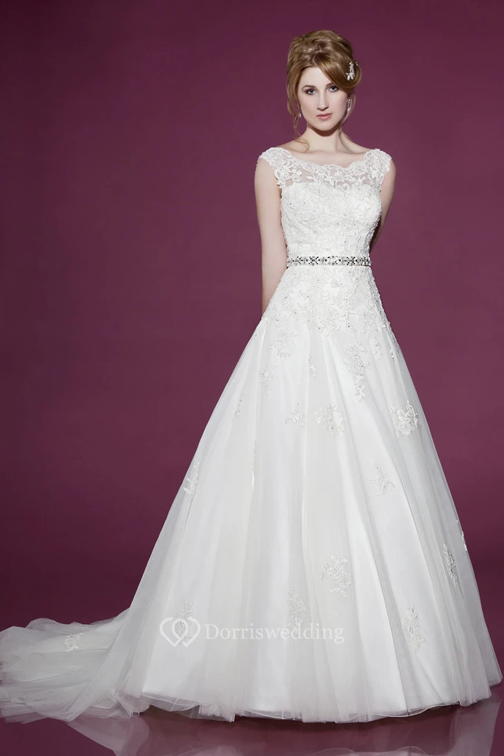 Maxi Bateau Appliqued Cap-Sleeve Lace&Tulle Wedding Dress