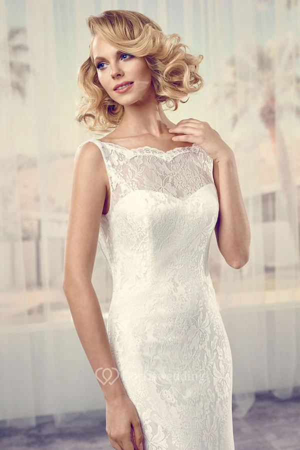 Maxi Bateau Jeweled Lace Wedding Dress With Sweep Train And V Back