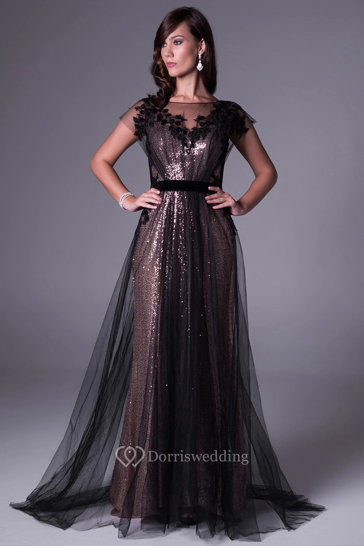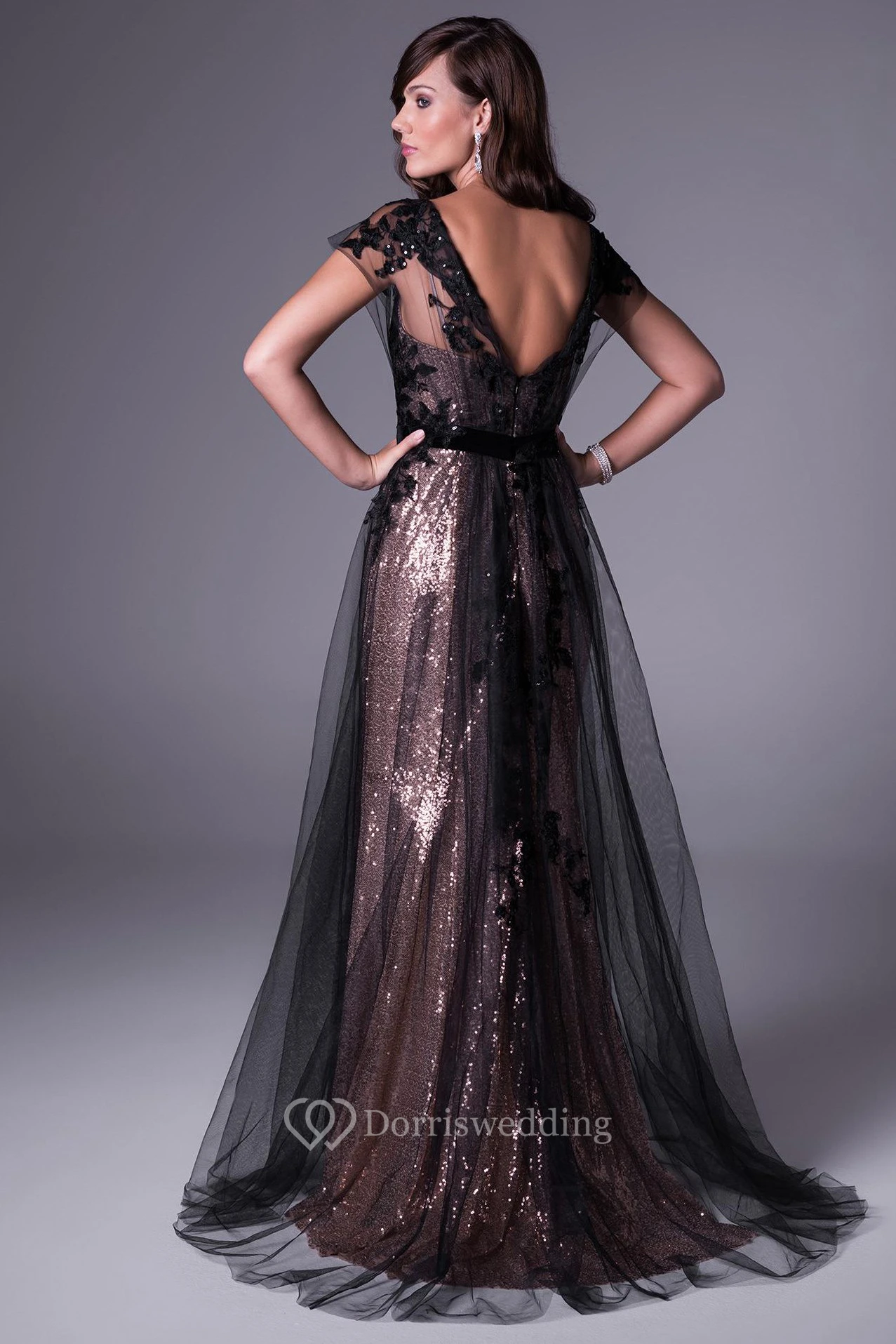Maxi Bateau Short-Sleeve Appliqued Sequins Prom Dress With Sweep Train And V Back