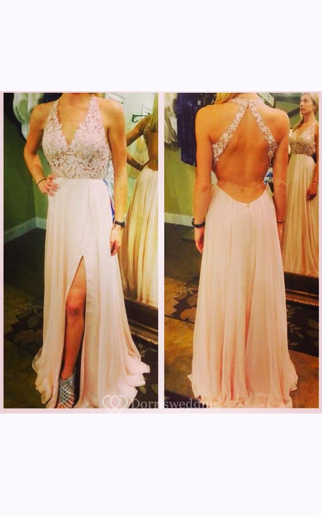 Maxi Halter Appliques Keyhole Chiffon Lace Dress