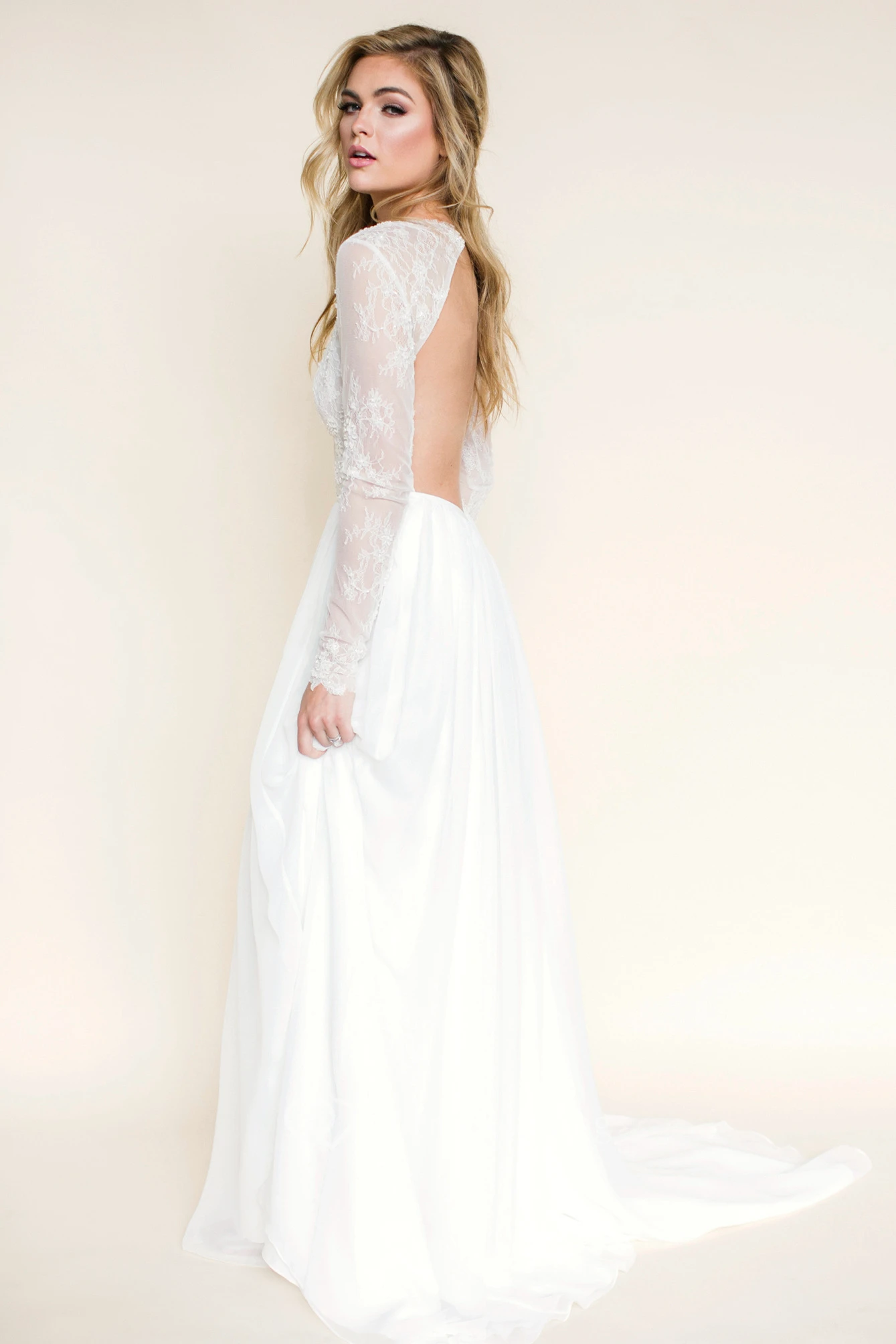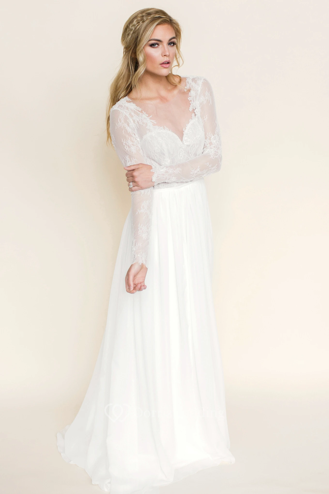 Maxi Illusion-Sleeve V-Neck Chiffon Wedding Dress With Lace And Backless Design