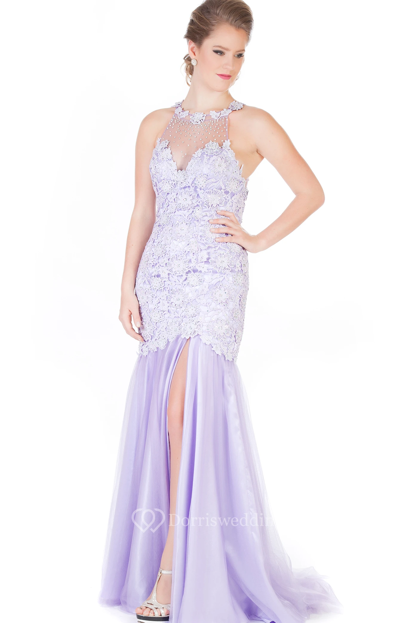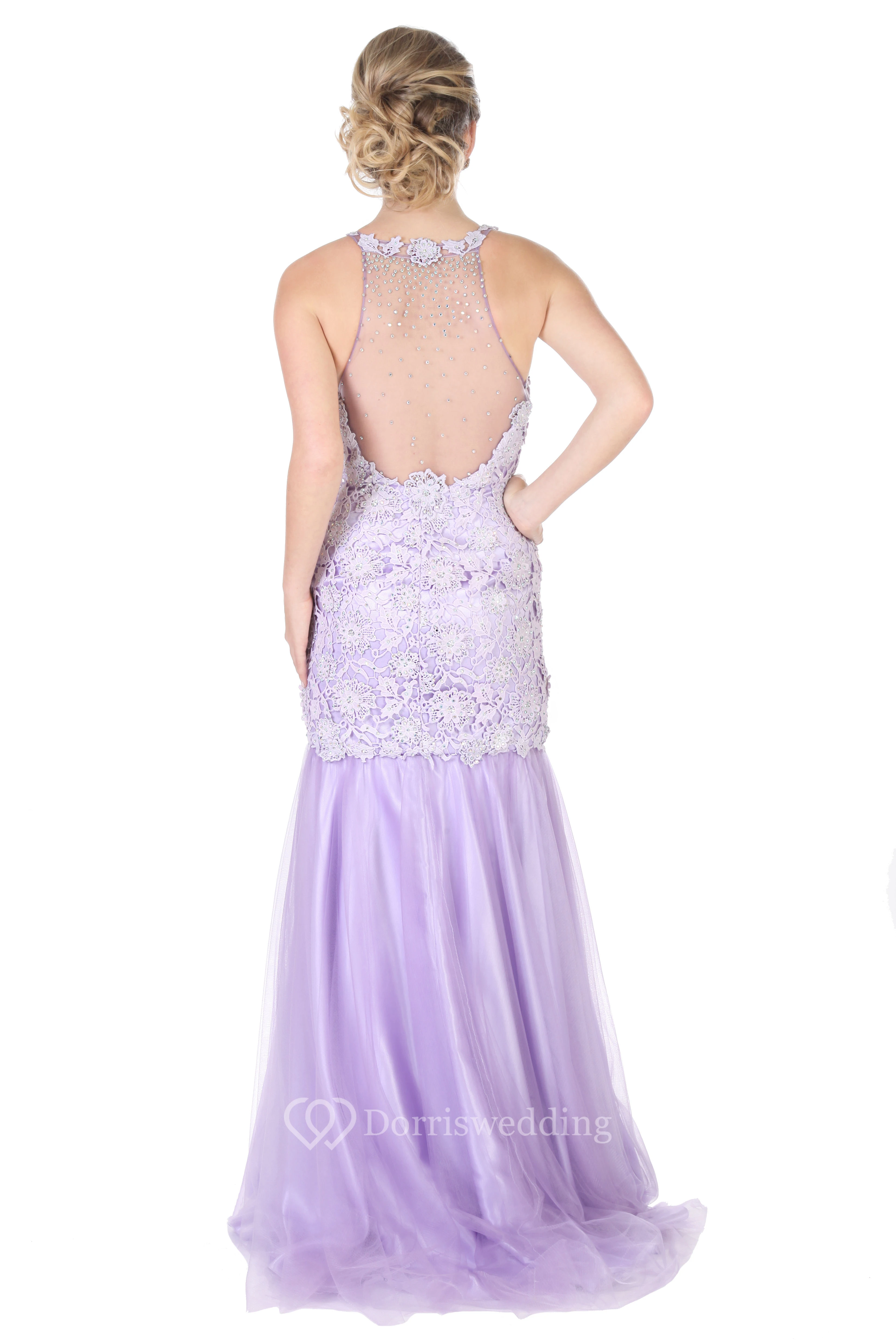 Maxi Mermaid Appliqued High Neck Sleeveless Tulle Prom Dress