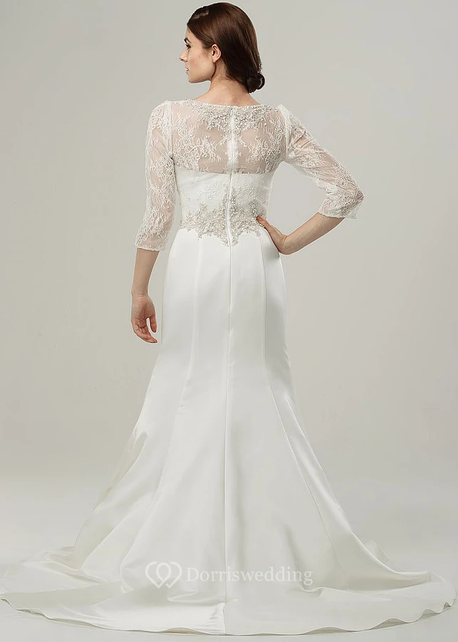 Maxi Scoop Appliqued 3-4-Sleeve Satin Wedding Dress With Sweep Train And Illusion