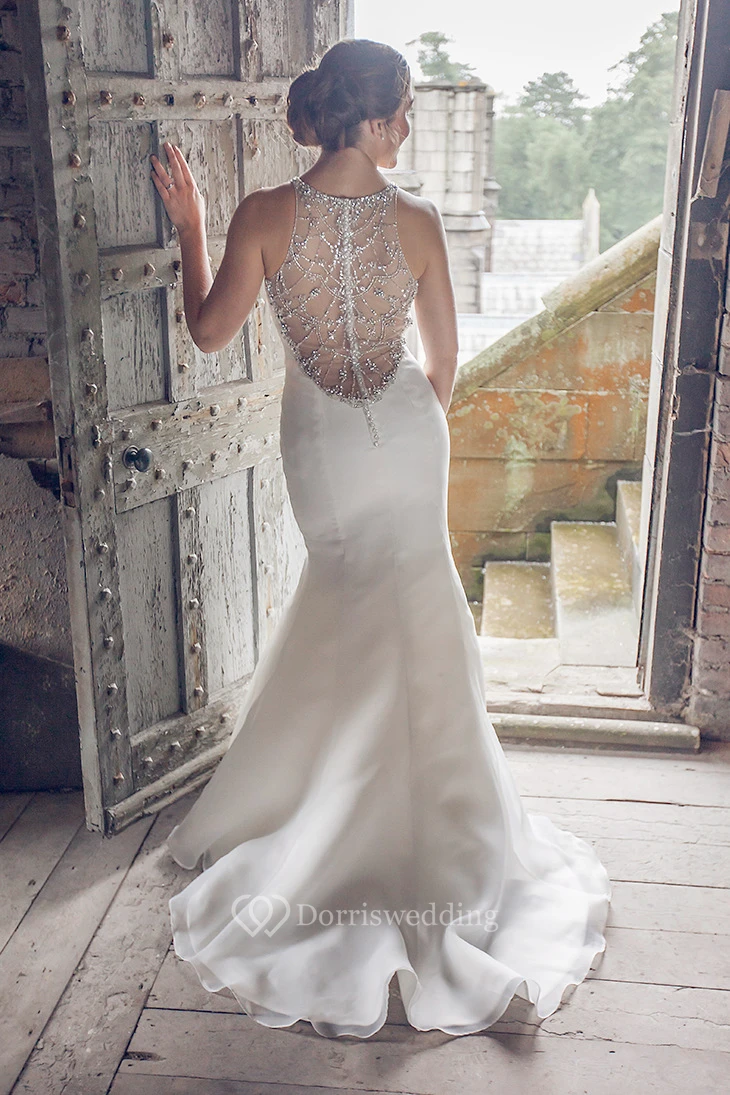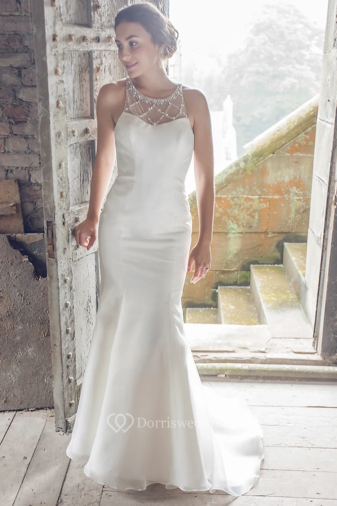Maxi Scoop Beaded Satin Wedding Dress With Sweep Train And Illusion