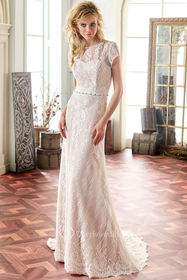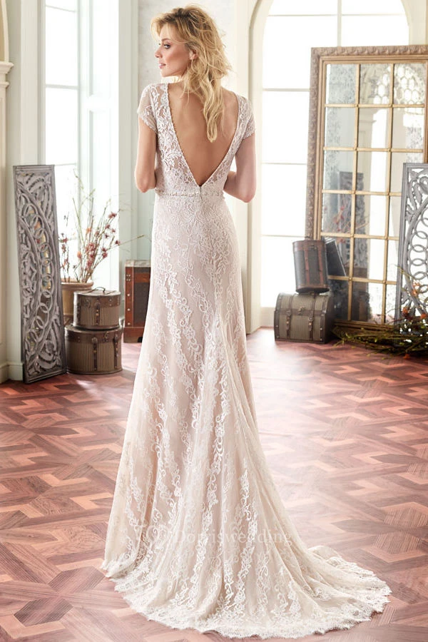 Maxi Scoop Cap-Sleeve Jeweled Lace Wedding Dress With Sweep Train And V Back